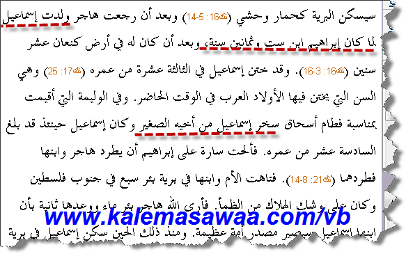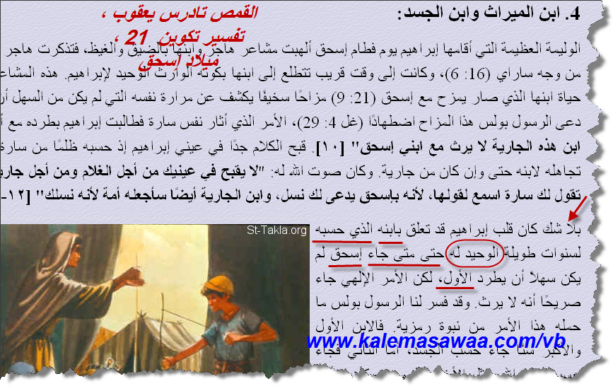 بسم الله الرحمن الرحيم.. سأستشهد ببعض المواضع الأخرى من الكتاب:- سفر التكوين 22:- 2:- فقال: خذ ابنك وحيدك، الذي تحبه، إسحاق، واذهب إلى أرض المريا، وأصعده هناك محرقة على أحد الجبال الذي أقول لك النص الإنجليزي:- And he said, Take now thy son, thine only son Isaac, whom thou lovest, and get thee into the land of Moriah; and offer him there for a burnt offering upon one of the mountains which I will tell thee of. النص العبري:- וַיֹאמֶר קַח נָּא אֶת בִׁנְּךָ אֶת יְּחִׁידְּךָ אֲשֶר אָהַבְּתָּ אֶת יִׁצְּחָּק וְּלֶךְ לְּךָ אֶל אֶרֶץ הַמֹרִׁיָּה וְּ העֲלֵהוּ שָּם לְּעֹלָּה עַל אַחַד הֶהָּרִׁים אֲשֶר אֹמַר אֵלֶיךָ نرى أنه يقول الإبن الوحيد ثم يضيف بعدها الذي تحبه! 12:- فقال: لا تمد يدك إلى الغلام ولا تفعل به شيئا، لأني الآن علمت أنك خائف الله، فلم تمسك ابنك وحيدك عني النص الإنجليزي:- And he said, Lay not thine hand upon the lad, neither do thou any thing unto him: for now I know that thou fearest God, seeing thou hast not withheld thy son, thine only son from me. النص العبري:- וַיֹאמֶר אַל תִׁשְּלַח יָּדְּךָ אֶל הַנַעַר וְּאַל תַעַשׂ לוֹ מְּאוּמָּה כִׁי עַתָּה יָּדַעְּתִׁי כִׁי יְּרֵא אֱלֹהִׁים אַתָּה וְּלֹא חָּשַׂכְּתָּ אֶת בִׁנְּךָ אֶת יְּחִׁידְּךָ מִׁמֶנִׁי هنا لا يقول الذي تحبه بل يقول إبنك الوحيد! 16:- وقال: بذاتي أقسمت ، يقول الرب، أني من أجل أنك فعلت هذا الأمر، ولم تمسك ابنك وحيدك . تعجبني جعل الصيغة "إبنك وحيك"! الإنجليزي:- And said, By myself have I sworn, saith the LORD, for because thou hast done this thing, and hast not withheld thy son, thine only son: العبري:- וַיֹאמֶר בִׁי נִׁשְּ בעְּתִׁי נְּאֻׁם יְּהוָּה כִׁי יַעַן אֲשֶר עָּשִׁׂיתָּ אֶת הַדָּבָּר הַזֶה וְּלֹא חָּשַׂכְּתָּ אֶת בִׁנְּךָ אֶת יְּחִׁידֶךָ إذن النصوص تقول الإبن الوحيد، والذي سيقول بأن إسماعيل عليه السلام إنفصل عن إبراهيم، فأقول له بأن كتاب تكوين ربا يذكر بأنهم عاشو مع بعض وأن إسماعيل سيسيطر على المعبد، وكذلك في كتاب أسرار موسى أو كتاب الأساتير السامري يذكر بأن إسماعيل سيرث حكم إبراهيم، إذن يسقط بذلك القول بأن الإبن الوحيد الذي كان يحبه إبراهيم هو إسحاق عليهم السلام، لأن ذلك فيه إسقاط لكتب التراث اليهودي سوائاً السامري أو العبري، وهذا ما قاله عبد المسيح بسيط في كتابه "هل تنبأ الكتاب المقدس عن نبي آخر بعد المسيح؟"و"من فمك أدينك" يا عبد المسيح بسيط.. فيذكر في كتابه "كما يجب أن لا نتجاهل التفسر اليهودي لنبوات العهد القديم فهو كتابهم ولهم قواعدهم في تفسيره وفهمه" إذن ما تقوله التفسيرات اليهودية من التراث اليهودي والسامري بأن إسماعيل لم ينفصل عن إبراهيم، وطبعاً لن يستطيع أن يخالف أحبار اليهود العبرانيين والسامريين الكتاب المقدس إلا ولو كان محرف، وهذا من دلائل تحريفه، والحمد لله رب العالمين. المزيد من مواضيعي