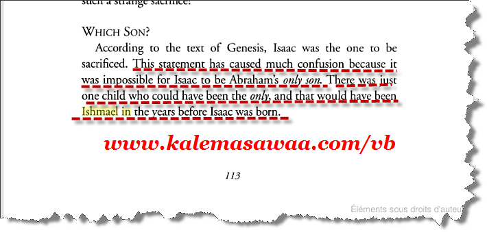 إبراهيم : إله واحد ، ثلاث زوجات ، وخمس ديانات صفحة : 113 http://books.google.it/books?id=LVUw...0becca&f=false ![]() ![]() حسب نص سفر التكوين إسحاق هو الذبيح ، لكن هذه الشهادة نتج عنها حيرة وتشويش كبيران ، من المستحيل أن يكون إسحق هو المقصود بالإبن الوحيد لإبراهيم . الإبن الوحيد الذي ينطبق عليه هذا الوصف هو إسماعيل لكونه وُلد بسنوات قبل إسحاق ... ![]() |
