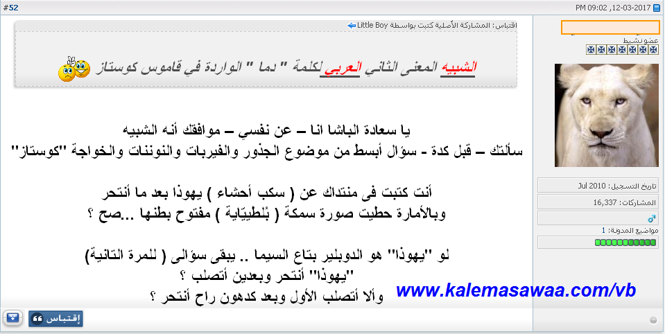 المرشوم - صفة - في خضمّ إعتراضه أكّد نفس طرحنا بدليل إستشهاده بنفس دليلنا الذي عرضناه في المشاركة رقم : 4 # ![]() الواضح أنّ المرشوم - صفة - كان قد خرج لتوّه من حصّة مناولة وقد أفرط في شرب دم المصلوب فلم يدري ما خطّ قلمه و ما كسبت يداه ! نشكره مجدّدا على التّعاون. يقول عابد الخشبة تعليقاً على ماجاء في قاموس Costaz أنقر هُنا ![]() مادامت كلمة دما الواردة في قاموس Costaz تعني شبيه / semblable و هي - بإعتراف المرشوم - عبارة عن وصف أو نعت لشيء ، فما الدّاعي يا ترى لنعت الحقل ووصفه بهكذا وصف : حقل الشبيه ؟؟؟؟ من خلال الصورة يظهر أنّ المرشوم قد سقط سقطة مدويّة مما حتّم تدخّل كبيره الذي علّمه السّحر لقصّ و تعديل مشاركته ![]() يُتبع ... |