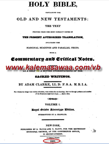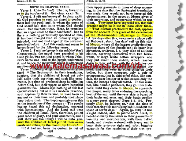 أدناه إحدى نسخ كتاب النّصارى المقدّس التي تعود لسنة 1833 : ![]() ![]() و في التفسير المُصاحب نقرأ ما مفاده : وهكذا تجرّد بنو إسرائيل من ثيابهم و زينتهم . هذه العادة كانت معروفة في ما مضى من الزمان ، و لا زالت تُمارس اليوم في الشّرق خلال مراسيم حج المحمّديين ( المسلمين ) إلى مكّة !!!