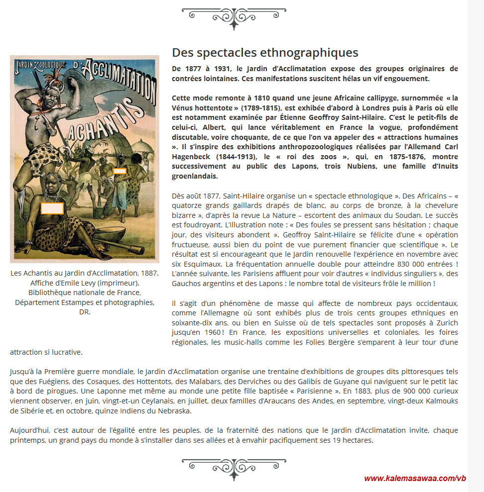 موقع حديقة الأقلمة(jardin d'acclimatation) يُفيد بأنّ بشراً سود البشرة وحتى من الإسكيمو أستُغلّوا للترفيه عن علية القوم من ذوي البشرة البيضاء عن طريق إقامة عروض إثنوغرافية !!!؟؟؟؟