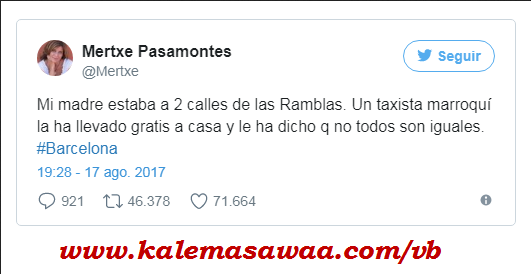 المصدر : من هُنا في سياق متّصل ، غرّدت الكاتبة و الأخصّائية النفسية Mertxe Pasamontes على صفحتها على تويتر بالقول : (( والدتي كانت على مرمى حجر ( شارعين فقط ) من مكان الهجوم . سائق تاكسي مغربي - في خطوة تضامنية - قام بتوصيلها إلى منزلها بدون مقابل وقال لها : لسنا كلّنا متشابهين - في إشارة إلى أنه ليس كل مسلم هو إرهابيّ - ! "))