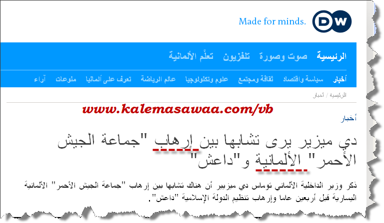 نقرأ في خبر أورده موقع دويتشه فيله عربي : دي ميزير يرى تشابها بين إرهاب "جماعة الجيش الأحمر" الألمانية و"داعش" ![]() ذكر وزير الداخلية الألماني توماس دي ميزيير أن هناك تشابها بين إرهاب "جماعة الجيش الأحمر" الألمانية اليسارية قبل أربعين عاما وإرهاب تنظيم الدولة الإسلامية "داعش". أخبار دي ميزير يرى تشابها بين إرهاب "جماعة الجيش الأحمر" الألمانية و"داعش" ذكر وزير الداخلية الألماني توماس دي ميزيير أن هناك تشابها بين إرهاب "جماعة الجيش الأحمر" الألمانية اليسارية قبل أربعين عاما وإرهاب تنظيم الدولة الإسلامية "داعش". قال توماس دي ميزيير وزير الداخلية الألماني اليوم (الأربعاء 30 أغسطس / آب 2017) إن كلا من داعش وجماعة الجيش الأحمر "يمثل الإصرار الأعمى والتمكين الذاتي لممارسة السلطة، وكيانا لمجموعة من الداعمين". وذكر دي ميزيير أن من أوجه التشابه المدهشة بينهما استخدام الوسائط الحديثة في الترويج، وأوضح مستطردا "جماعة الجيش الأحمر كانت تستخدم بجانب المنشورات شرائط الفيديو، التي كانت وسيطا جديدا في ذلك الحين، لتحقيق تأثير أكبر على الجماهير وممارسة ضغوط على الدولة... إرهاب جماعة الجيش الأحمر كان عصريا للغاية من الناحية الإعلامية. تنظيم داعش يفعل ذلك اليوم على نحو مختلف إلى حد ما بالوسائط الجديدة، لكن هناك تشابه بينهما من الناحية الهيكلية". ![]() يذكر أن جماعة الجيش الأحمر قامت بسلسلة من الجرائم الإرهابية في ألمانيا قبل أربعين عاما. ويعتبر عام 1977 من أسوأ الأعوام التي شهدت عمليات إرهابية في تاريخ ألمانيا. المصدر: دويتشه فيله عربي
