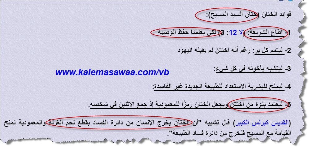 إضافة جدّاً قيّمة أخي الحبيب شهاب ،، بارك الله فيك . -------------------------------------- لكي ندقّ آخر إسفين في تابوت إعتراضات المنصّر و عصابته نورد المزيد من الأدلة على تحريم بولس صانع و مؤسّس المسيحية للختان : الدّليل الأول : نقرأ من كتاب : الكهنوت لـِ البابا شنودة الثالث تحت باب : وصية الختان بين العهدين إن الله لا يضع وصاياه عبثًا، ولا يتغير في تعليمه. إن الله لا يضع وصاياه عبثًا، ولا يتغير في تعليمه. إن الله لا يضع وصاياه عبثًا، ولا يتغير في تعليمه. إن الله لا يضع وصاياه عبثًا، ولا يتغير في تعليمه. إن الله لا يضع وصاياه عبثًا، ولا يتغير في تعليمه. إن الله لا يضع وصاياه عبثًا، ولا يتغير في تعليمه. ![]() هل قرأتَ و إستوعبتَ جيّداًً هذه الجملة يا تابع بولس ؟؟؟ الدّليل الثاني : من تعاليم بولس واضع لبِنَة المسيحية نقرأ : كولوسي 2 : 11 وَبِهِ أَيْضًا خُتِنْتُمْ خِتَانًا غَيْرَ مَصْنُوعٍ بِيَدٍ، بِخَلْعِ جِسْمِ خَطَايَا الْبَشَرِيَّةِ، بِخِتَانِ الْمَسِيحِ. في التفسير المصاحب بقلم بنيامين بنكرتن : ![]() الدّليل الثالث : نقلاً عن موقع التكلا المسيحي :