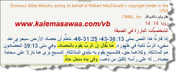 رؤيا 14 : 14 ثُمَّ نَظَرْتُ وَإِذَا سَحَابَةٌ بَيْضَاءُ، وَعَلَى السَّحَابَةِ جَالِسٌ شِبْهُ ابْنِ إِنْسَانٍ، لَهُ عَلَى رَأْسِهِ إِكْلِيلٌ مِنْ ذَهَبٍ، وَفِي يَدِهِ مِنْجَلٌ حَادٌّ. التفسير المسيحي بقلم وليم ماكدونالد :