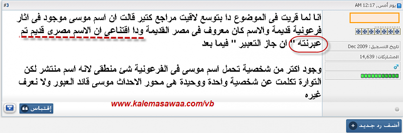 يقول أحد عُبّاد الوثن : ![]() عزيزنا الدكتور( مُنصّر ) يعترف : إسم موسى إسم مصري فرعوني تمّت " عبرنته" =========> أي تحريفه إن جاز التعبير ![]() قرآن ربّ العزة ذكر الإسم كما نطقه المصريون : مو ---- سى ،،،،، و بدون " عبرنة " موسى =========> التي معناها : إبن الماء . الآن ياسادة ، أيّهما أصدق قيلا ، قرآن ربّ العزّة أم كتاب النصارى المقدس ...! المزيد من مواضيعي