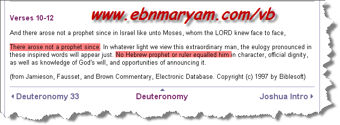 تثنية 18 : 18 أُقِيمُ لَهُمْ نَبِيًّا مِنْ وَسَطِ إِخْوَتِهِمْ مِثْلَكَ، وَأَجْعَلُ كَلاَمِي فِي فَمِهِ، فَيُكَلِّمُهُمْ بِكُلِّ مَا أُوصِيهِ بِهِ. ![]() لا نبيّ مثل موسى عليه السلام قام من بني إسرائيل ! أعداد تقطع الطّريق أمام أيّ إحتمالية قيام نبيّ من بني إسرائيل سواء يشوع أو يسوع أو غيره : ترجمة Amplified Bible : Since that time no prophet has risen in Israel like Moses, whom the Lord knew face to face ترجمة Christian Standard Bible : No prophet has arisen again in Israel like Moses, whom the Lord knew face to face ترجمة Contemporary English Version : There has never againbeen a prophet in Israel like Moses. The Lord spoke face to face with him ترجمة Douay-Rheims 1899 American Edition : And there arose no more a prophet in Israel like unto Moses, whom the Lord knew face to face ترجمة Easy-to-Read Version : Israel never had another prophet like Moses: The Lord knew Moses face to face وصلّى الله وسلّم وبارك على النبيّ الخاتم سيّدنا محمد المُبشّر به . |