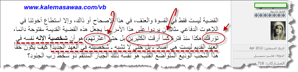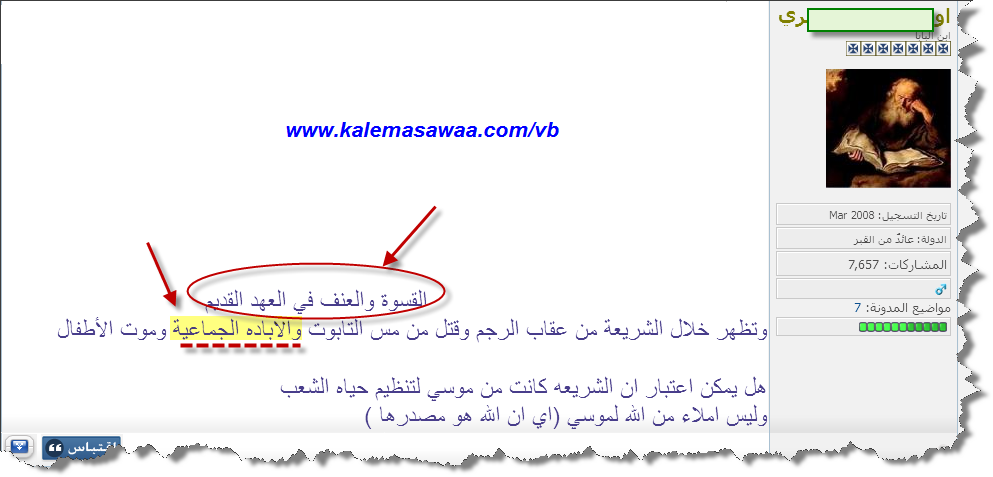 ![]() اللهم صل على محمد وعلى آله وصحبه أجمعين ،، سؤال لأحد المنصّرين الذي فقد البوصلة و وقع في حيص بيص أمام قساوة و عنف و وحشية إله العهد القديم : ![]() ![]() جواب أحد لصوص الأديان و قطاع طرق الشريعة الذي حاول تثبيت أخيه في الإيمان و المعمودية لكنه لم يزد الطين إلاّ بلّة : ![]() ![]() للخروج من المأزق ، المنصّر ( صاحب السؤال الذي فارق النوم مقلتيه ) يبحث عن '' شرعنة" للعنف في العهد القديم بإلقاء اللّوم على موسى النبيّ و كأنّه عليه السّلام أتى بتلك النّصوص الدّموية من كيسه الخاصّ ! الرّد: كتاب النصّارى من الدفّة إلى الدفّة ( من تكوين إلى رؤيا ) هو - بحسب الفكر المسيحي - ( وحي ) من الله ! تيموثاوس الثانية 3 : 16 كُلُّ الْكِتَابِ هُوَ مُوحًى بِهِ مِنَ اللهِ، وَنَافِعٌ لِلتَّعْلِيمِ وَالتَّوْبِيخِ، لِلتَّقْوِيمِ وَالتَّأْدِيبِ الَّذِي فِي الْبِرِّ ![]() ![]() هل نصوص القتل و الإبادة الجماعية أتى بها موسى النبيّ عليه السلام من بنات أفكاره ؟؟؟ الإجابة هي : لا ! هي ذي الشواهد الكتابية : خروج 4 : 28 فَأَخْبَرَ مُوسَى هَارُونَ بِجَمِيعِ كَلاَمِ الرَّبِّ الَّذِي أَرْسَلَهُ، وَبِكُلِّ الآيَاتِ الَّتِي أَوْصَاهُ بِهَا. ![]() ![]() عدد 11 : 24 فَخَرَجَ مُوسَى وَكَلَّمَ الشَّعْبَ بِكَلاَمِ الرَّبِّ، وَجَمَعَ سَبْعِينَ رَجُلاً مِنْ شُيُوخِ الشَّعْبِ وَأَوْقَفَهُمْ حَوَالَيِ الْخَيْمَةِ. ![]() ![]() تثنية 5 : 5 أَنَا كُنْتُ وَاقِفًا بَيْنَ الرَّبِّ وَبَيْنَكُمْ فِي ذلِكَ الْوَقْتِ لِكَيْ أُخْبِرَكُمْ بِكَلاَمِ الرَّبِّ، لأَنَّكُمْ خِفْتُمْ مِنْ أَجْلِ النَّارِ، وَلَمْ تَصْعَدُوا إِلَى الْجَبَلِ. ![]() ![]() ولاعزاء للمرجفين ! للمزيد من مواضيعي
