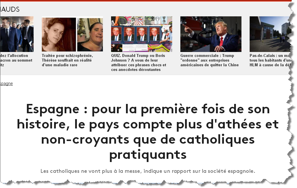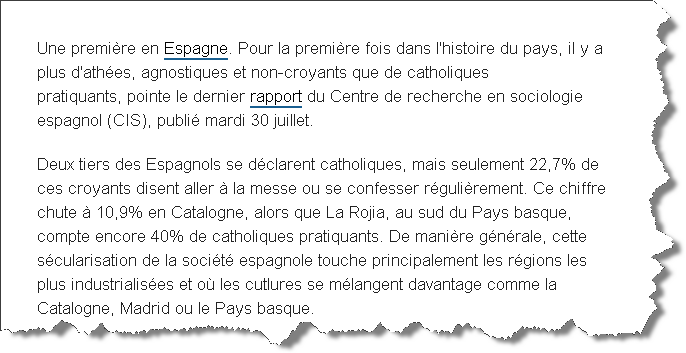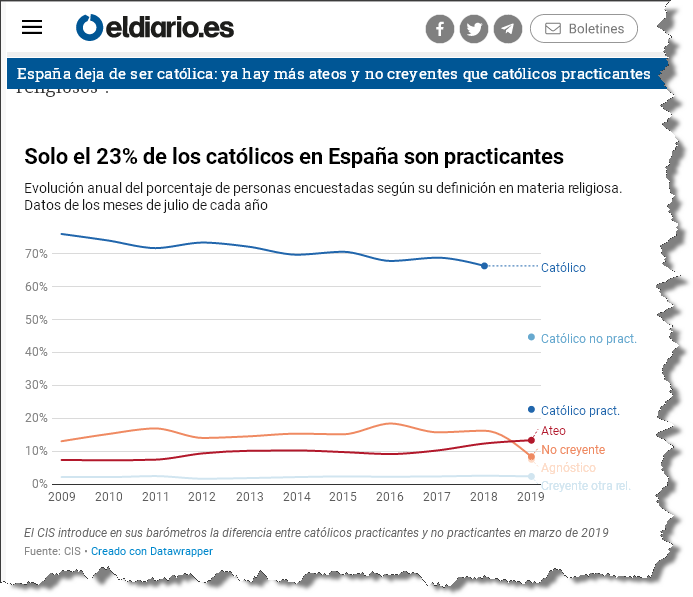للمرة الأولى في تاريخ إسبانيا يُسجل تزايد عدد المُلحدين و اللادينيين على حساب الكاثوليك ! بحسب تقرير المركز الإسباني للأبحاث السوسيولوجية المُسمّى اختصاراً CIS : الكاثوليكيون هجروا الكنيسة و حضور القداس أصبح من الماضي ! المصدر : من هُنا للمزيد من مواضيعي