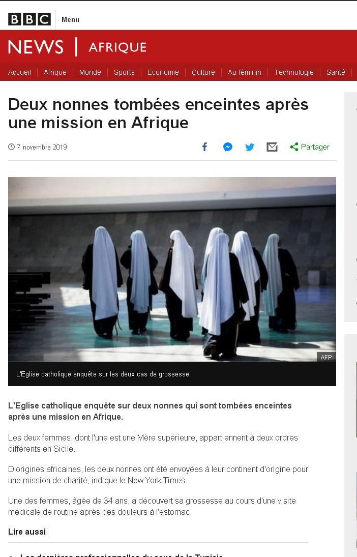 ![]() اللهم صل على محمد وعلى آله وصحبه أجمعين ،، ![]() أفاد موقع بي بي سي في نسخته الفرنسية بإكتشاف حمل راهبتين كانتا في مهمة توزيع مساعدات بافريقيا . ![]() المصدر من هُنا للمزيد من مواضيعي