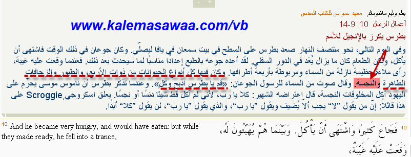 14 فَقَالَ بُطْرُسُ: «كَلاَّ يَا رَبُّ! لأَنِّي لَمْ آكُلْ قَطُّ شَيْئًا دَنِسًا أَوْ نَجِسًا».