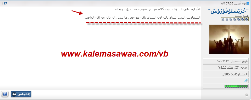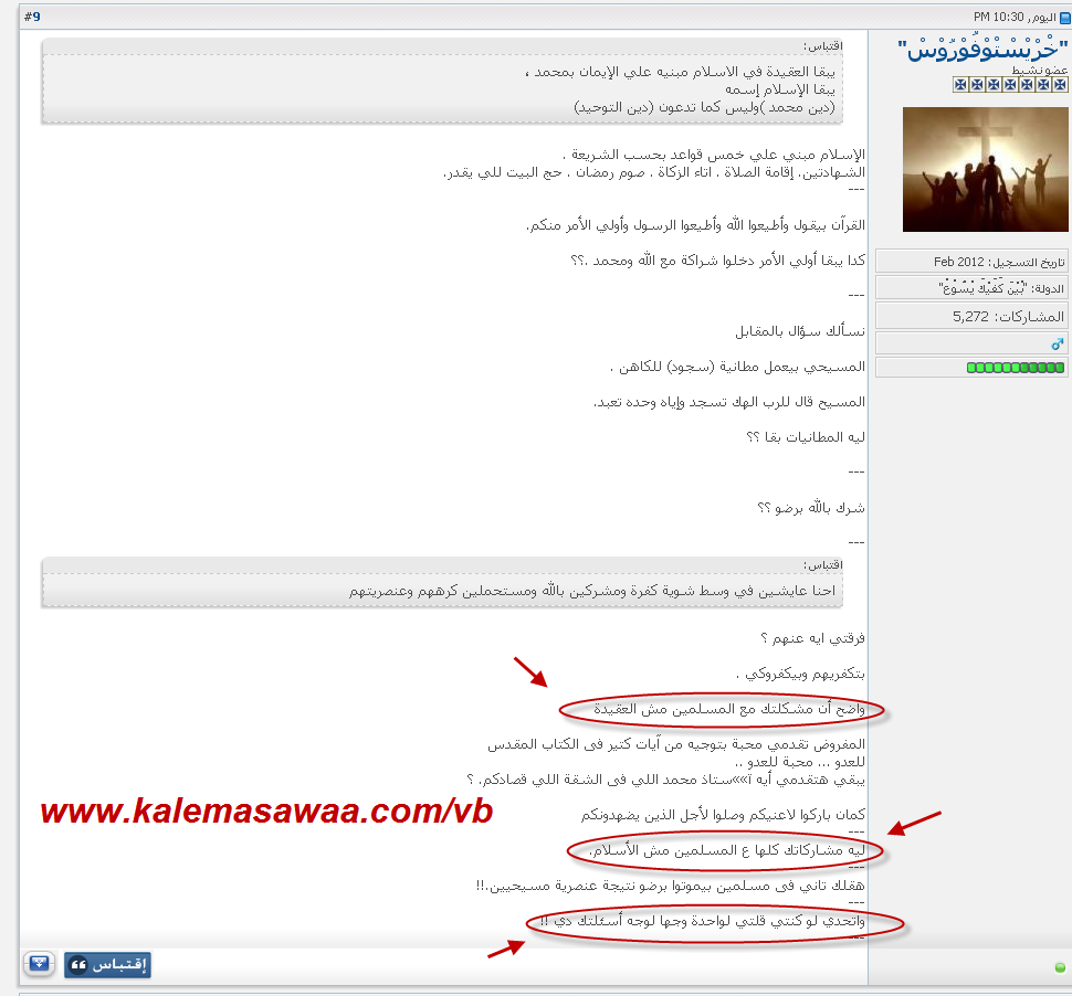 ![]() اللهم صل على محمد وعلى آله وصحبه أجمعين ،، يوحنا 10: 27 خِرَافِي تَسْمَعُ صَوْتِي، وَأَنَا أَعْرِفُهَا فَتَتْبَعُنِي. حوار أجري على صفحات منتدى الزريبة العربية و تم حذفه من طرف كبيرة المشرفين المنصرة العجوز أمة . خرفان الزريبة لم يدر في خلدهم أن الموضوع يتم تصويره أولاً بأوّل . عن الجانب المسلم : Fblau عن الجانب المسيحي: المنصّرة التي تُدعى الملكة هيلانة كان هذا عنوان الموضوع : ![]() صورة بتاريخ اليوم للملف الشخصي للمحاور المسلم بعد حذف الموضوع و تصفير عدّاد مشاركاته : ![]() تعليق في قسم آخر لأحد المسيحيين المحترمين الذي تدخل بشكل إيجابي في الموضوع بعد أن تمّ توبيخه و تقريعه من طرف المنصّرة العجوز أمة كبيرة مشرفي الزريبة العربية : ![]() نص الشبهة : ![]() العملية تمّت بإنزال خفيّ خلف دفاعات المنصّرين و قد أختير لها إسم fall blau :) ![]() ملاحظة: شكر و تقدير للاخ " مؤمن آل فرعون " يُتبع بالنّشر بعد جهوزية باقي الصّور ...... للمزيد من مواضيعي