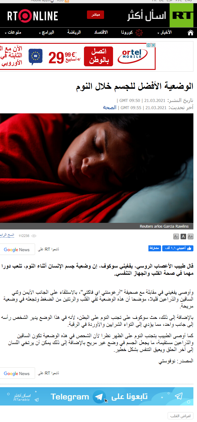 ![]() اللهم صل على محمد وعلى آله وصحبه أجمعين ،، نقرأ من صحيح الحديث النّبويّ الشّريف : إِذَا أتَيْتَ مَضْجَعَكَ، فَتَوَضَّأْ وُضُوءَكَ لِلصَّلَاةِ، ثُمَّ اضْطَجِعْ علَى شِقِّكَ الأيْمَنِ، ثُمَّ قُلْ: اللَّهُمَّ أسْلَمْتُ وجْهِي إلَيْكَ، وفَوَّضْتُ أمْرِي إلَيْكَ، وأَلْجَأْتُ ظَهْرِي إلَيْكَ، رَغْبَةً ورَهْبَةً إلَيْكَ، لا مَلْجَأَ ولَا مَنْجَا مِنْكَ إلَّا إلَيْكَ، اللَّهُمَّ آمَنْتُ بكِتَابِكَ الذي أنْزَلْتَ، وبِنَبِيِّكَ الذي أرْسَلْتَ، فإنْ مُتَّ مِن لَيْلَتِكَ، فأنْتَ علَى الفِطْرَةِ، واجْعَلْهُنَّ آخِرَ ما تَتَكَلَّمُ بهِ. قالَ: فَرَدَّدْتُهَا علَى النبيِّ صَلَّى اللهُ عليه وسلَّمَ، فَلَمَّا بَلَغْتُ: اللَّهُمَّ آمَنْتُ بكِتَابِكَ الذي أنْزَلْتَ، قُلتُ: ورَسولِكَ، قالَ: لَا، ونَبِيِّكَ الذي أرْسَلْتَ. الراوي : البراء بن عازب | المحدث : البخاري | المصدر : صحيح البخاري الصفحة أو الرقم: 247 | خلاصة حكم المحدث : [صحيح] التخريج : أخرجه البخاري (247)، ومسلم (2710) ![]() في السّياق ذاته يُطالعنا موقع آرتي -عربي الرّوسي بهذا الخبر و مفاده : الوضعية الأفضل للجسم خلال النوم قال طبيب الأعصاب الروسي، يفغيني سوكوف، إن وضعية جسم الإنسان أثناء النوم، تلعب دورا مهما في صحة القلب والجهاز التنفسي. وأوصى يفغيني في مقابلة مع صحيفة "أرغومنتي اي فاكتي"، بالاستلقاء على الجانب الأيمن وثني الساقين والذراعين قليلا، موضحا أن هذه الوضعية تقي القلب والرئتين من الضغط وتجعله في وضعية مريحة. بالإضافة إلى ذلك، حث سوكوف على تجنب النوم على البطن، لأنه في هذا الوضع يدير الشخص رأسه إلى جانب واحد، مما يؤدي إلى التواء الشرايين والأوردة في الرقبة. كما أوصى الطبيب بتجنب النوم على الظهر نظرا لأن الشحص في هذه الوضعية تكون الساقين والذراعين مستقيمة، ما يجعل الجسم في وضع غير مريح بالإضافة إلى ذلك يمكن أن يرتخي اللسان إلى آخر الحلق ويعيق التنفس بشكل خطير. المصدر: نوفوستي للوصول إلى المصدر يُرجى النّقر هُنا للمزيد من مواضيعي