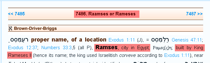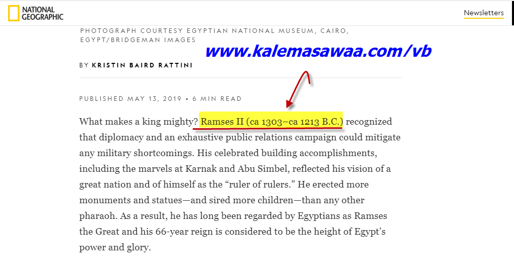 سفر الملوك الأول ، 1/6 : وفي السنة الأربع مئة والثمانين لخروج بني إسرائيل من أرض مصر، في السنة الرابعة من ملك سليمان على إسرائيل، في زيو وهو الشهر الثاني، بدأ سليمان ببناء هيكل الرب. ملاحظة: السنة الرابعة من ملك سليمان على إسرائيل = 965 ق م ![]() https://www.thesacredcalendar.com من النص ذاته يمكننا حساب السنة التي تم فيها خروج العبرانيين من مصر : 965 + 480 = 1445 ق م يعني الخروج كان في سنة 1445 قبل الميلاد ، يعني في القرن 15 ق.م ، جميل جدا ،، من أين انطلق العبرانيون في رحلة هروبهم ؟؟؟؟ انطلقوا من رعمسيس ( Rameses ) خروج 37/12 : ورحل بنو إسرائيل من رعمسيس إلى سكوت بنحو ست مئة ألف راجل، ما عدا النساء والأطفال. نص خروج37/12 ترجمة كينغ جيمس : And the children of Israel journeyed from Rameses to Succoth, about six hundred thousand on foot that were men, beside children يعرف لنا قاموس الهولي بايبل رعمسيس كالتالي : رعمسيس أو Rameses هي مدينة بمصر ( الفرعونية ) ، بناها رمسيس الثاني ، ![]() ![]() رمسيس الثاني بحسب موقع ناشونال جيوغرافيك عاش بين 1303– 1213 قبل الميلاد . https://www.nationalgeographic.com/c...icle/ramses-ii فكيف يُعقل أن يكون العبرانيون قد خرجوا من مدينة لم تكن قد بُنيت بعد ؟؟؟؟