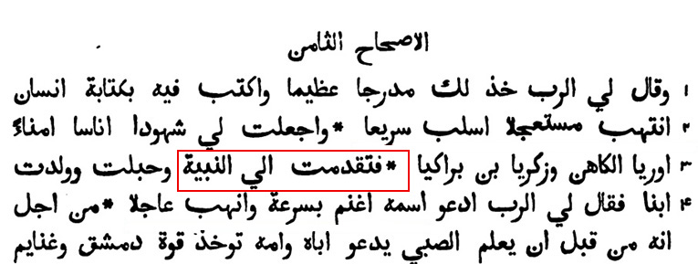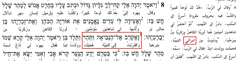 هذا نص ترجمة الفاندايك : 3-8 فَاقْتَرَبْتُ إِلَى النَّبِيَّةِ فَحَبِلَتْ وَوَلَدَتِ ابْناً. فَقَالَ لِي الرَّبُّ: ((ادْعُ اسْمَهُ مَهَيْرَ شَلاَلَ حَاشَ بَزَ. و هذا نص الترجمة الكاثوليكية : 3-8 ودَنَوتُ مِنَ النَّبِيَّة، فحَمَلَت ووَلَدَتِ آبناً. فقالَ لِيَ الرَّبّ: (( أُدعُ آسمَه مَهيرْ شالالْ حاشْ باز، و هذا نص ترجمة كتاب الحياة : 3-8 ثُمَّ عَاشَرْتُ النَّبِيَّةَ فَحَمَلَتْ وَأَنْجَبَتِ ابْناً. فَقَالَ لِي الرَّبُّ: «ادْعُ اسْمَهُ مَهَيْرَ شَلاَلَ حَاشَ بَزَ، صاحب الترجمة المشتركة هو من شعر بالخزي من الاشارة إلى تلك العلاقة الآثمة فأضاف كلمة " امرأتي " : و هذا نص الترجمة المشتركة : 3-8 ودنَوتُ مِنِ اَمرأتي النبيَّةِ، فحمَلَت وولَدَتِ اَبنًا. فقالَ ليَ الرّبُّ: ((سَمِّهِ: أسرِعْ إلى السَّلبِ، بادِرْ إلى النَّهبِ. و كما هو واضح من ترجمة بين السطور أن كلمة " امرأتي " غير موجودة في النص العبري : و هذه صورة ترجمة وليم واطس .. و كلمة امرأتي غير موجودة : يعني ذاك الذي سيسرع إلى النهب و السلب و يصبح زعيم عصابة هو أصلا ثمرة علاقة آثمة ... يعني قصة كلها منحطة دفعت المترجم إلى التحريف بإضافة كلمة " امرأتي " إلى النص ! المزيد من مواضيعي