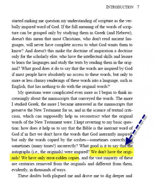 يا سلام ... اتفضل ... ناخد اعتراف مباشر .... يقول بارت ايرمان احد اكبر علماء المخطوطات فى الكرة الأرضية (1) We don't have the originals........We have only error ridden copies نحن لا نمتلك الأصول.... ما نمتلكه هو نسخ محرفة مثال كمان جاء فى الترجمة اليسوعية ... فأن نص العهد الجديد .. قد نسخ ثم نسخ طوال قرون كثيرة ....بيد نساخ طلاحهم للعمل متفاوت ... وما من واحد منهم معصوم من مختلف الأخطاء التى تحول دون ان تتصف أية نسخة كانت ... مهما بذل فيها من الجد ... بالموافقة التامة للمثال الذى أخذت عنة ... يضاف الذى ذلك أن بعض النساخ حاولوا احيانا عن حسن نية ان يصوبوا ما جاء فى مثالهم وبدا لهم أنة يحتوى على أخطاء واضحة ..أو قلة فى التعبير اللاهوتى ...وهكذا أدخلوا لى النص قراءات جديدة تكاد أن تكون كلها خطأ .... ثم يمكن أن يضاف الى ذلك كلة ...ان الاستعمال الكثير من الفقرات من العهد الجديد ...فى أثناء إقامة شعائر العبادة .. أدى أحيانا كثيرة ...الى ادخال زخارف غايتها تجميل الطقس أو الى توفيق بين نصوص مختلفة ....ساعدت علية التلاوة بصوت عالى ومن الواضح أن ما ادخلة النساخ من التبديل على مر القرون ...تركم بعضة على بعضة الاخر فكان النص الذى وصل اخر الأمر الى الطباعة مثقلأ بمختلف أنواع التبديل ظهرت فى عدد كبير من القرءات .... هذا قولك يا صديقى