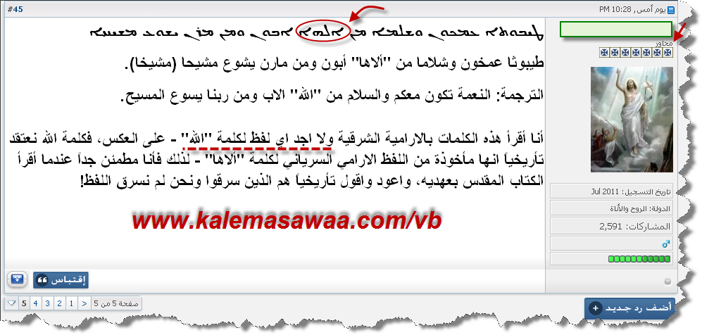 يقول المحاور النصراني متناسيا أنّ حبل الكذب قصير : ![]() للردّ على كلام تلميذ الكذّاب الأشر بولس نورد مجموعة من الشواهد الكتابية التي تضم اسم الجلالة الله ===>ܐܲܠܵܗܵܐ ومن الأناجيل الأربعة ! متى 3 : 9 ܘܠܐ ܬܣܒܪܘܢ ܘܬܐܡܪܘܢ ܒܢܦܫܟܘܢ ܕܐܒܐ ܐܝܬ ܠܢ ܐܒܪܗܡ ܐܡܪ ܐܢܐ ܠܟܘܢ ܓܝܪ ܕܡܫܟܚ ܐܠܗܐ ܡܢ ܗܠܝܢ ܟܐܦܐ ܠܡܩܡܘ ܒܢܝܐ ܠܐܒܪܗܡ مرقس 2 : 7 ܕܡܢܐ ܗܢܐ ܡܡܠܠ ܓܘܕܦܐ ܡܢܘ ܡܫܟܚ ܠܡܫܒܩ ܚܛܗܐ ܐܠܐ ܐܢ ܚܕ ܐܠܗܐ لوقا 1 : 30 ܘܐܡܪ ܠܗ ܡܠܐܟܐ ܠܐ ܬܕܚܠܝܢ ܡܪܝܡ ܐܫܟܚܬܝ ܓܝܪ ܛܝܒܘܬܐ ܠܘܬ ܐܠܗܐ يوحنا 1: 18 ܐܠܗܐ ܠܐ ܚܙܐ ܐܢܫ ܡܢ ܡܬܘܡ ܝܚܝܕܝܐ ܐܠܗܐ ܗܘ ܕܐܝܬܘܗܝ ܒܥܘܒܐ ܕܐܒܘܗܝ ܗܘ ܐܫܬܥܝ التلميذ فاق معلمه بولس في احتراف الكذب ! المدلّس يزعم أن ّ القرآن الكريم أقتبس او بمعنى ادق " سرق " إسم الجلالة " الله " من لغات أخرى ! ربما المدلّس يجهل أنّ اللغة العربية هي لغة سامية و بالتالي من الطبيعي أن يكون لها إرث لغوي مشترك مع لغات سامية أخرى كالعبرية و الأرامية ! مثال كلمتان بنفس معنى و منطوق اللغة العربية : דם = دم ܒܝܬܐ= بيت للحسم في مسألة الكلمة ܐܲܠܵܗܵܐ (إسم الجلالة الله ) نُحيل المُرجف على الكتاب و رقم الصفحة أدناه : ![]() ![]() مغامرة النّصراني انتهت دكتورنا الحبيب . و الصياد أصبح طريدة ! المزيد من مواضيعي
