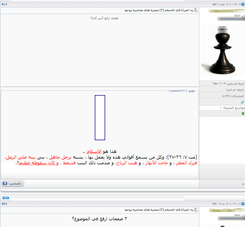 قام بعدها النصراني بكتابة مداخلته التي بات يسهر عليها من أجل أن يفضحني,ولكن دوماً تأتي الرياح بما لا تشته السفن,فهذا العيي,قد إدعى إني أخطأت وأني أقول كلاماً ليس موجوداً بالحديث,مع إن كلامي كان من كلام العلماء وبالادلة ,لكن إفلاسه إضطره إلى هذا الإدعاء,وبعد أن فضحته وطالبته بتوضيح موطن الخطأ,ظل إلى هذه اللحظة يتلاعب ويتشقلب حتى يضع أي كلام يُعتبر في مقياسه ومقياس أعباطه رداً,ولكنه في الحقيقة ‘‘ سد خانة ’’ وهو مصطلح إزداد في الآونة الأخيرة مع أمثال هؤلاء. بعدها كتب زميله الآخر مداخلة وكأنه لم يتم تعريته ولا أي شئ,بكل دياثة أقصد برود,يسأل مرة أخرى سؤاله الذي أجبته عليه في مداخلتي الحارقة التي تم حذفها بدون إبداء أي سبب, ومرة أخرى ينال صفعة على قفاه,فهذا العيي لم يعد يجد ما يقول فبدأ يتخبط لأقوم بصفعه من جديد ![]() إنتهى أمر هذين النصرانيين والحمد لله رب العالمين...! ![]() فَقُطِعَ دَابِرُ الْقَوْمِ الَّذِينَ ظَلَمُوا وَالْحَمْدُ لِلَّهِ رَبِّ الْعَالَمِينَ![]() الأنعام 45