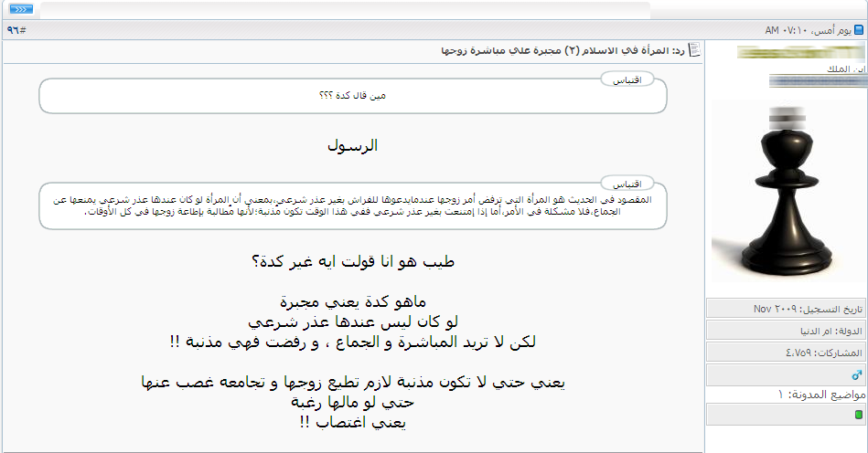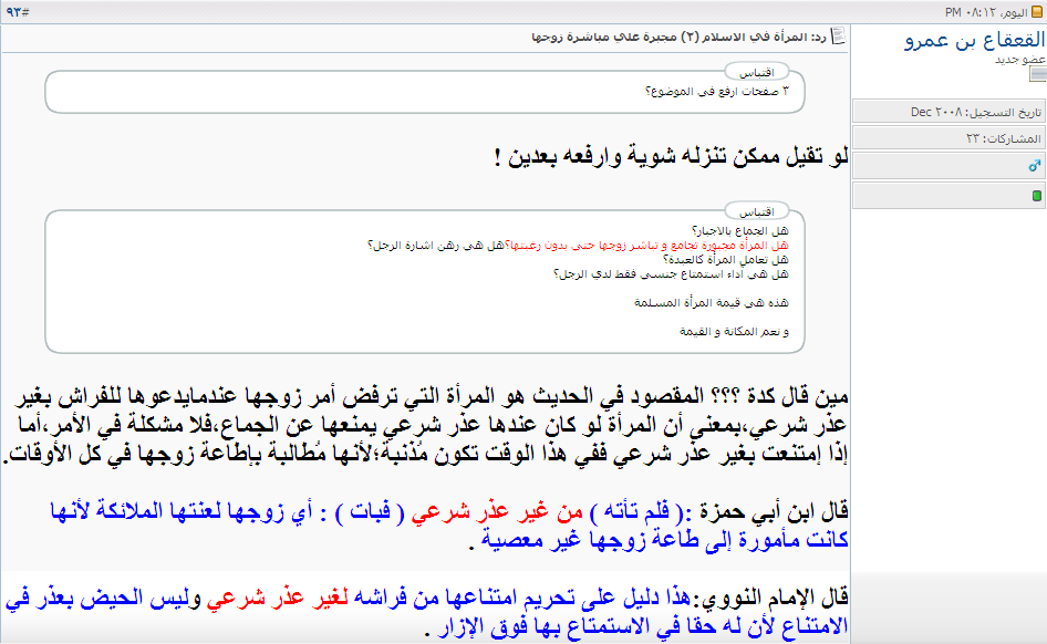 هو ده كمان بقى أستاذ ![]() أكيد أستاذ تدليس ، أستاذ لف و دوران بصراحة أنا أشهد له : أشهد له فى اللف و الدوران و إخراج الحوار من مضمونه هو مش شايف دى : 1 - إذا دعا الرجل امرأته إلى فراشه فأبت ، فبات غضبان عليها ، لعنتها الملائكة حتى تصبح . الراوي: أبو هريرة المحدث: البخاري - المصدر: صحيح البخاري - لصفحة أو الرقم: 3237 خلاصة حكم المحدث: [صحيح] 2 - إذا دعا الرجل امرأته إلى فراشه ، فلم تأته ، فبات غضبان عليها ، لعنتها الملائكة حتى تصبح الراوي: أبو هريرة المحدث: مسلم - المصدر: صحيح مسلم - لصفحة أو الرقم: 1436 خلاصة حكم المحدث: صحيح 3 - إذا دعا الرجل امرأته إلى فراشه فأبت فلم تأته فبات غضبان عليها لعنتها الملائكة حتى تصبح الراوي: أبو هريرة المحدث: أبو داود - المصدر: سنن أبي داود - لصفحة أو الرقم: 2141 خلاصة حكم المحدث: سكت عنه [وقد قال في رسالته لأهل مكة كل ما سكت عنه فهو صالح] 4 - إذا دعا الرجل امرأته إلى فراشه فأبت فلم تأته فبات غضبان عليها لعنتها الملائكة حتى تصبح الراوي: أبو هريرة المحدث: الألباني - المصدر: صحيح أبي داود - لصفحة أو الرقم: 2141 خلاصة حكم المحدث: صحيح 5 - إذا دعا الرجل امرأته إلى فراشه فأبت فبات ؛ غضبان عليها ، لعنتها الملائكة حتى تصبح الراوي: أبو هريرة المحدث: الألباني - المصدر: صحيح الجامع - لصفحة أو الرقم: 532 خلاصة حكم المحدث: صحيح و لا و ظريف يا اخواتى بيقولك