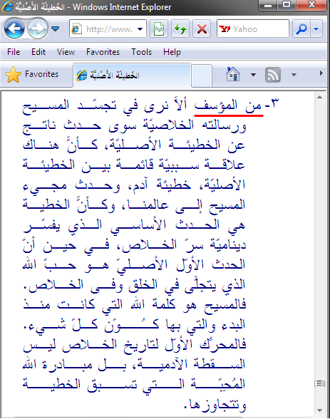 . جاء في كتاب ’’الخَطيئَة الأصْليَّة كَيْفَ نفهَمْهَا اليَوم‘‘ للأبّ عَـزيز الحَلاّق اليَسُوعيّ ص27 ![]() . يخجل الأب عزيز الحلاق اليسوعي ان يُصرِّح بأن العهد الجديد هو ايضاً لم يوجد به أي ذكر للخطيئة الأصلية ، واستبدل كلمة "كل" بـ "معظم" . ![]() ولكن يكفينا ان العهد القديم لم يذكر أي شيء عن الخطيئة الأصلية ، وهذا يعني ان من جاء قبل يسوع بما فيهم الأنبياء لم تؤمن بالخطية الجدية ولا بالتثليث ولا بالصلب والفداء ..إلخ . ![]() يتبع :- |
