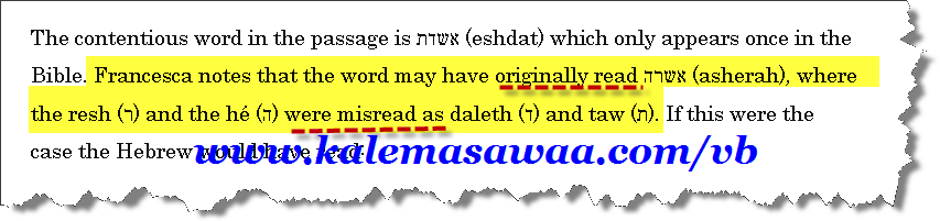 عدنا ولله الحمد ،،، بشأن " أشيرا " تقول البروفيسور Francesca Stavrakopoulou أستاذة التوراة و الديانات القديمة ورئيسة قسم اللاّهوت بجامعة exeter ببريطانيا : http://humanities.exeter.ac.uk/theol...stavrakopoulou كلمة אשדת " إشدات " نجدها مرّة واحدة ووحيدة في نص العهد القديم ،، و تضيف قائلة : من المحتمل أن الكلمة ذاتها هي في الأصل אשרה " أشيرا " لكن تمّت قراءة حرفي ال "ريش "(ר) و ال" هي " (ה) على التوالي خطأ ك " دالت " (ד) و " تاف" (ת) ![]() النتيجة : אשרה "أشيرا" قـُرأت خطأ =============> אשדת " إشدات " אשרה = أشيرا אשדת = إشدات المُثير في الموضوع هو كون معنى إشدات אֵשְׁדָּת مشكوك فيه ...! ![]() ![]() ![]() (meaning uncertain) ![]() ![]() ![]() http://lexiconcordance.com/hebrew/0799.html أشيرا في نص تثنية 16 :21 כא לֹא-תִטַּע לְךָ אֲשֵׁרָה, כָּל-עֵץ: אֵצֶל, מִזְבַּח יְהוָה אֱלֹהֶיךָ--אֲשֶׁר תַּעֲשֶׂה-לָּךְ. Thou shalt not plant thee an Asherah of any kind of tree beside the altar of the LORD thy God, which thou shalt make thee. http://www.mechon-mamre.org/p/pt/pt0516.htm الترجمات العربية للنص أعلاه تضحك على الذقون ![]() تمّ استبدال إسم אֲשֵׁרָה " أشيرا " ب : كلمة "سارية " ![]() ترجمة سميث وفاندايك : (( لا تَنْصُبْ لِنَفْسِكَ سَارِيَةً مِنْ شَجَرَةٍ مَا بِجَانِبِ مَذْبَحِ الرَّبِّ إِلهِكَ الذِي تَصْنَعُهُ لكَ )) نذكّر فقط بانّ אֲשֵׁרָה "أشيرا " هي إسم علم و أسماء الأعلام لا تترجم ...! ![]() دمتم بخير .... |