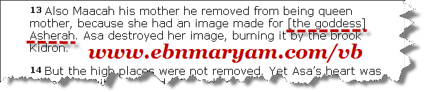 سبحان الله !!! هو أنا جبت الكلام ده من عندي؟؟؟ كتابك المقدّس هو اللي بيقول : أشيرا وُضعت بجوار مذبح يهوه لتُعبد كإلهة ...! لو نسيت النصّ أفكّرك بيه .