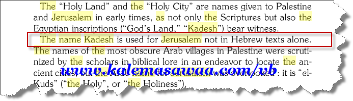 وده نفس الكلام اللي بيقوله كتابه المقدس : تثنية-33-2 ترجمة مشتركة : فقال: ((أقبل الرب من سيناء، وأشرق لهم من جبل سعير، وتجلى من جبل فاران، وأتى من ربى القدس وعن يمينه نار مشتعلة. تثنية-33-2 ترجمة كاثوليكية : فقال: ((أقبل الرب من سيناء وأشرق لهم من سعير وسطع من جبل فاران وأتى من ربوات قادش من جنوبه إلى المنحدرات إليهم. قادش تطلع إيه ؟؟؟ قادش = القدس ( أورشليم ) المصدر : From the Exodus to King Akhnaton الكاتب : Immanuel Velikovsky صفحة :163 ![]() قاموس سميث بيقول كمان : قادش هي مدينة ،،