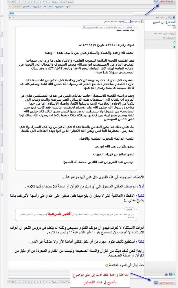 قام أحد الجهلاء بفتح موضوع عن فتوى المفاخدة,وإستمر الموضوع لـ 12 صفحة كاملة,حينما رأيت الموضوع قلت فرصة لنصفع هذا الجاهل المجهال,فكتبت مداخلة واحدة,لكن المفاجأة التي لم أتوقعها هي غلق الموضوع بصمت دون أي إبداء للسبب,أو حتى أدنى محاولة للدفاع عن الفتوى,فهذا يُثبت ما قلته لهم بأنها منحولة تم تأليفها...فهل يا ترى سيستشدون بها بعد ذلك ...؟ ![]() لا تعلـــيــــق ....! المزيد من مواضيعي
