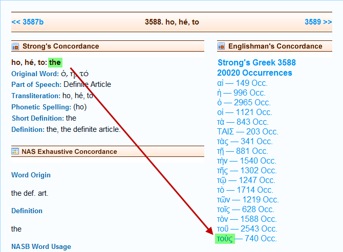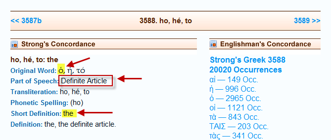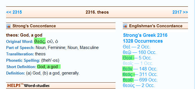 حسناً سأضعها لك من العربية و العبرية و اليونانية ، لنرى أن ذات الكلمة اليونانية التى يستشهد بها النصارى على ألوهية المسيح قيلت عن غيره و جاءت فى حق آخرين مُعرفة . يقول الله عن القضاة : "أنا قلت إنكم آلهة وبنو العلي كلكم" (مز 82 : 6) PSA-82-6 אֲֽנִי־אָ֭מַרְתִּי אֱלֹהִ֣ים אַתֶּ֑ם וּבְנֵ֖י עֶלְיֹ֣ון כֻּלְּכֶֽם الترجمة السبعينية (اليونانية للعهد القديم) :- ![]() ![]() ![]() هى ذات الكلمة التى قالها توما للمسيح - عليه السلام - فلم لا نعتبر هؤلاء هم الله ؟! و كذلك أُطلِقت هذه الكلمات على الآلهة الباطلة التى تُعبد من دون الله .حيث يقول كاتب سفر الخروج : "ولما رأى الشعب أن موسى أبطأ في النزول من الجبل اجتمع الشعب على هارون وقالوا له: قم اصنع لنا آلهة تسير أمامنا لأن هذا موسى الرجل الذي أصعدنا من أرض مصر لا نعلم ماذا أصابه" (خر 32 : 1) EXO-32-1 וַיַּ֣רְא הָעָ֔ם כִּֽי־בֹשֵׁ֥שׁ מֹשֶׁ֖ה לָרֶ֣דֶת מִן־הָהָ֑ר וַיִּקָּהֵ֨ל הָעָ֜ם עַֽל־אַהֲרֹ֗ן וַיֹּאמְר֤וּ אֵלָיו֙ ק֣וּם׀ עֲשֵׂה־לָ֣נוּ אֱלֹהִ֗ים אֲשֶׁ֤ר יֵֽלְכוּ֙לְפָנֵ֔ינוּ כִּי־זֶ֣ה׀ מֹשֶׁ֣ה הָאִ֗ישׁ אֲשֶׁ֤ר הֶֽעֱלָ֙נוּ֙ מֵאֶ֣רֶץ מִצְרַ֔יִם לֹ֥א יָדַ֖עְנוּ מֶה־הָ֥יָה לֹֽו و ها هو النص من السبعينية :- ![]() ![]() ![]() هى ذات الكلمة التى قالها توما للمسيح - عليه السلام - فلم لا نعتبر هؤلاء هم الله ؟! و الآن مع الكلمة حين أُستخدمت الكلمة مع آلهة باطلة بأداة تعريف و كانت أداة التعريف هى المظللة فى الصورة التالية :- http://concordances.org/greek/3588.htm قال يثرون حمى موسى – عليه السلام - : "الآن علمت أن الرب أعظم من جميع الآلهة لأنه في الشيء الذي بغوا به كان عليهم" (خر 18 : 11) و ها هو النص فى السبعينية و به أداة التعريف فى حق الآلهة الباطلة :- ![]() ![]() ![]() هى ذات الكلمة التى قالها توما للمسيح - عليه السلام - و معرفة كما يود النصرانى ، فلم لا تعبد هؤلاء يا نصرانى ؟!