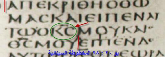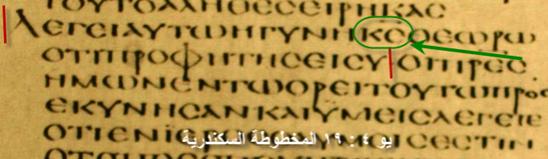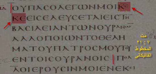 العجيب أن النصرانى يستشهد بكلام علماءه ، لكن حينما نستشهد نحن بهذا الكلام يضرب به عرض الحائط ، فلم يلتفت لكلام الدكتور "وهيب جورجى" ، و كأنه كلامى أنا ! حسناً ! لنرجع إلى اللغة الأصلية التى كُتِبَ بها العهد الجديد (اليونانية) لنرى من الرابط التالى كلمة (رب أو سيد) ، و أعذرونا أننا سنسير نقطة نقطة ، لكون النصرانى لا يعلم عن الكلمة شيئاً فى أصولها اليونانية كما سيتضح لكم . http://concordances.org/greek/2962.htm هذه هى الكلمة (κύριος) و الأحوال المختلفة التى سنراها فيها حسب موقعها من الجملة . الآن أيها القارىء الكريم صاحب العقل و التمييز و ليس النصرانى الذى أكتب رداً على كلامه ، فهو لا يقرأ من الأساس كما هو واضح للجميع أو بالأحرى يهرب من مداخلاتى ... نأخذ مجموعة من النصوص التى يستشهد بها النصرانى فى أصولها اليونانية . يقول المسيح – عليه السلام - : "ليس كل من يقول لي: يا رب ، يا رب ! يدخل ملكوت السماوات. بل الذي يفعل إرادة أبي الذي في السماوات"(مت 7 : 21) Nestle-Aland NOVUM TESTAMENTUM MAT-7-21: ου πας ο λεγων μοι κυριε κυριε εισελευσεται εις την βασιλειαν των ουρανων αλλ ο ποιων το θελημα του πατρος μου του εν τοις ουρανοις قبل أن نرى النص من المخطوطات لنقارن بينه و بين غيره كما سنرى بعد قليل ، ننظر لهذا الجدول الذى يظهر منه إختصار (κύριος) فى المخطوطات . و الآن مع المخطوطات ، البداية بالمخطوطة السينائية :- المخطوطة الفاتيكانية :- النص الثانى هو قول توما : "أجاب توما وقال لهم :ربي وإلهي!"(يو 20 : 28) و رغم كون ترجمة الفاندايك تضع علامة تعجب ، لكننا سنساير من يستشهد بهذا النص على أن المسيح – عليه السلام – هو المقصود من كلام توما . Greek NT: Tischendorf 8th Edition JOH-20-28: ἀπεκρίθη Θωμᾶς καὶ εἶπεν αὐτῷ· ὁ κύριός μου καὶ ὁ θεός μου النص فى المخطوطة السينائية :- النص فى المخطوطة الفاتيكانية :- نكتفى بهذه الأمثلة ممن قالوا للمسيح - عليه السلام - (κύριος) و ننتقل إلى آخرين قيل لهم كلمة (κύριος) و قبل الإنتقال إلى هذه الأمثلة أحب الإشارة إلى أن النص الأخير جاءت فيه الكلمة (κύριος) مُعرفة بــ (ὁ) ، و لاحظوا أداة التعريف من الرابط التالى :- http://concordances.org/greek/3588.htm و هذا التنبيه فقط لكون النصرانى يُصر على إقحام اللغة العربية فى الموضوع و القول بأن كلمة (κύριος) التى يترجمونها (رب) لا تأتى معرفة سوى لله ، فيقول :