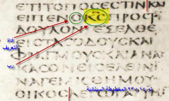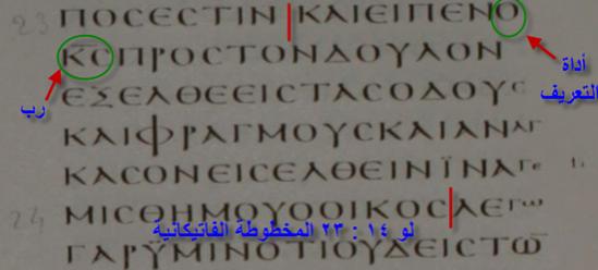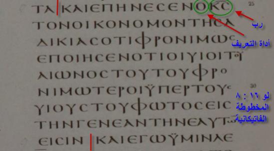 و سأثبت له أنها (κύριος) أتت معرفة مع آخرين غير المسيح . قص المسيح – عليه السلام – قصة فى (لو 14 : 15 – 24) عن إنسان (و ليس الله) (لو 14 : 16) أعد وليمة فدعى إليها فى النهاية العرج و المساكين و الجدع و العمى ، و قد قام بهذه الدعوة عبد من عبيد هذا الإنسان .. وعندما لم يمتلىء البيت "فقال الــسيد للعبد: اخرج إلى الطرق والسياجات وألزمهم بالدخول حتى يمتلئ بيتي" (لو 14 : 23) Greek NT: Tischendorf 8th Edition LUK-14-23: καὶ εἶπεν ὁ κύριος πρὸς τὸν δοῦλον· ἔξελθε εἰς τὰς ὁδοὺς καὶ φραγμοὺς καὶ ἀνάγκασον εἰσελθεῖν, ἵνα γεμισθῇ μου ὁ οἶκος· النص فى المخطوطة السينائية :- النص فى المخطوطة الفاتيكانية :- ![]() ![]() ![]() ها هى (κύριος) التى تُرجمت حين قيلت للمسيح (رب) جاءت فى حق غير المسيح - عليه السلام - و الأكثر أنها جاءت مُعرفة مُطلقة كما يود النصرانى . لماذا ترجمتم الكلمة مع المسيح إلى (رب) و مع الآخرين إلى (سيد) رغم كونها مُعرفة و مُطلقة كما تُريد ؟! هل أضع لك الدفاع الذى يُقدمه إخوانك و من ثم أرد عليه ؟! رأفةً بك لن أضعه لأشعرك أنك تُشارك فى ما تحسبه حوار و تضع ما تظنه ردود :) قصة آخرى قصها المسيح – عليه السلام – فى (لو 16 : 1 – 8) عن وكيل لرجل غنى وشى به ، فعزله الغنى عن وظيفته فحاول أن يجد له وظيفة آخرى ، فصنع لنفسه أصدقاء من مديونى هذا الغنى بأن كتب لهم صكوكاً بأقل ما كان عليهم للغنى ، يقول المسيح – عليه السلام - : "فمدح الـسيد وكيل الظلم إذ بحكمة فعل ، لأن أبناء هذا الدهر أحكم من أبناء النور في جيلهم." (لو 16 : 8) Greek NT: Tischendorf 8th Edition LUK-16-8: καὶ ἐπῄνεσεν ὁ κύριος τὸν οἰκονόμον τῆς ἀδικίας ὅτι φρονίμως ἐποίησεν· ὅτι οἱ υἱοὶ τοῦ αἰῶνος τούτου φρονιμώτεροι ὑπὲρ τοὺς υἱοὺς τοῦ φωτὸς εἰς τὴν γενεὰν τὴν ἑαυτῶν εἰσίν. النص فى المخطوطة السينائية :- النص فى المخطوطة الفاتيكانية :- ![]() ![]() ![]() مرة آخرى ..! ها هى (κύριος) التى تُرجمت حين قيلت للمسيح (رب) جاءت فى حق غير المسيح - عليه السلام - و الأكثر أنها جاءت مُعرفة مُطلقة كما يود النصرانى . لماذا ترجمتم الكلمة مع المسيح إلى (رب) و مع الآخرين إلى (سيد) رغم كونها مُعرفة و مُطلقة كما تُريد ؟! هل أضع لك الدفاع الذى يُقدمه إخوانك و أرد عليه ؟! رأفةً بك لن أضعه لأشعرك أنك تُشارك فى ما تحسبه حوار و تضع ما تظنه ردود :)