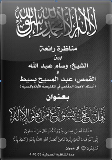 | مناظرة, أبوالخير, معلم, والقمص, وسام, النمل, الداعية, بسيط, بعنوان(, يسوع, عبدالله, عبدالمسيح |