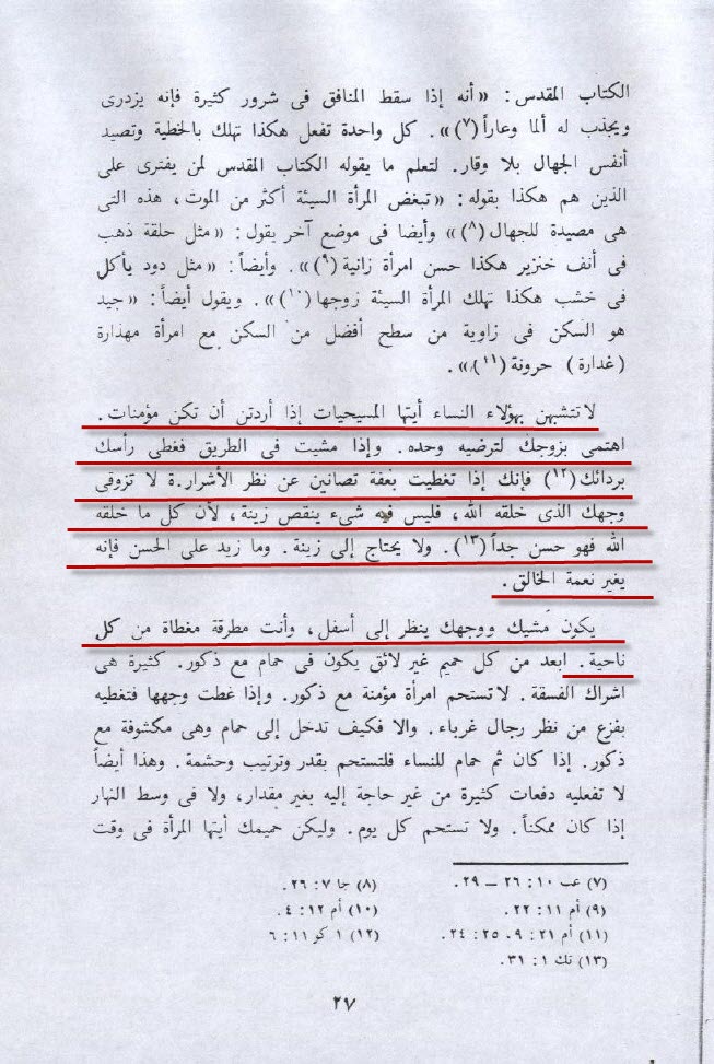 1- الحجاب واجب على المرأة المسيحية ...لتكون مؤمنة !!! ( لا تتشبهن بهؤلاء النساء أيتها المسيحيات إذا أردتن ان تكن مؤمنات. اهتمي بزوجك لترضيه وحده. وإذا مشيت في الطريق فغطي رأسك بردائك فإنك إذا تغطيت بعفة تُصانين عن نظر الأشرار.) 2- النقاب الكامل واجب على المرأة المسيحية !!! (يكون مشيك ووجهك ينظر إلى اسفل وأنت مطرقة مغطاة من كل ناحية.ابعد من كل حميم غير لائق يكون في حمام مع ذكور. كثيرة هي اشراك الفسقة.لا تستحم امراة مؤمنة مع ذكور. واذا غطت وجهها فتغطيه بفزع من نظر رجال غرباء. وإلا فكيف تدخل إلى حمام وهي مكشوفة مع ذكور). ملاحظة : جرت العادة في الدولة الرومانية أيام المسيح وحواريوه أن تكون الحمامات عامة للجميع نساء ورجال. والحميم : يُقصد به أي غسيل بالماء ...سواء للطهارة أو الإستنجاء أو حتى غسل الوجه فقط أو اليدين . 3- الماكياج والميك أب ..حرام ...حرام ... يا نساء المسيحية ...!!!! ( لا تزوقي وجهك الذي خلقه الله. فليس فيه شيء ينقص زينة, لأن كل ما خلقه الله فهو حسن جداً. ولا يحتاج إلى زينة. وما زيد على الحسن فهو يُغير نعمة الخالق) 4- تحريم التبرج...وتزين المرأة للغريب...!!!! (اعلمن أيتها النساء ان المراة الموافقة لزوجها تنال كرامة كثيرة من الله الآب. ان اردت ان تكوني مؤمنة ومرضية لله فلا تتزيني لكي تُرضي رجالاً غرباء) 5- تحريم ارتداء الثياب الخفيفة والعارية ... لباس الزانيات....!! (ولا تشتهي لبس المقانع والثياب الخفيفة التي لا تليق إلا بالزانيات ليتبعك الذين يصيدون من تكون هكذا. وان كنت لا تفعلين هذه الافعال القبيحة للخطية فانك بتزينك وحده تُدانين, لأنك بذلك تضطرين من يراك ان يتبعك ويشتهيك. فلماذا لا تتحفظين حتى لا تقعي في الالخطية ولا تدعي احد يقع في عثرة لاجلك.إذا أخطأت باعتمادك هذا الفعل فانك تسقطين,لأنك تكونين سبباً في هلاك نفس ذلك الرجل. ثم إذا أخطأت على واحد بنفس هذا الفعل دفعة واحدة فهو يكون سبباً في أنك تخطئين على كثيرين, وأنت في قلة الرجاء , كما يقول الكتاب المُقدس " أنه إذا سقط المنافق في شرور كثيرة فإنه يُزدرى ويجلب له ألماً وعاراً" كل واحدة تفعل هكذا تهلك بالخطية وتصيد انفس الجهال بلا وقار. لتعلم ما يقوله الكتاب المقدس لمن يفتري على الذين هم هكذا بقوله " تبغض المرأة السيئة أكثر من الموت, هذه التي هي مصيدة للجهال" وأيضاً في موضوع آخر يقول " مثل حلقة ذهب في أنف خنزير هكذا حُسن امرأة زانية") يا نساء النصرانية ...مازاد لكم الإسلام على ذلك إلا الصلاة وعبادة الله وحده فاتقوا الله وخافوا عقابه وخلصوا أنفسكم باتباع الحق وشهادة أن لا إله إلا الله محمداً رسول الله -جزى الله صاحب البحث خير الجزاء- للمزيد من مواضيعي
