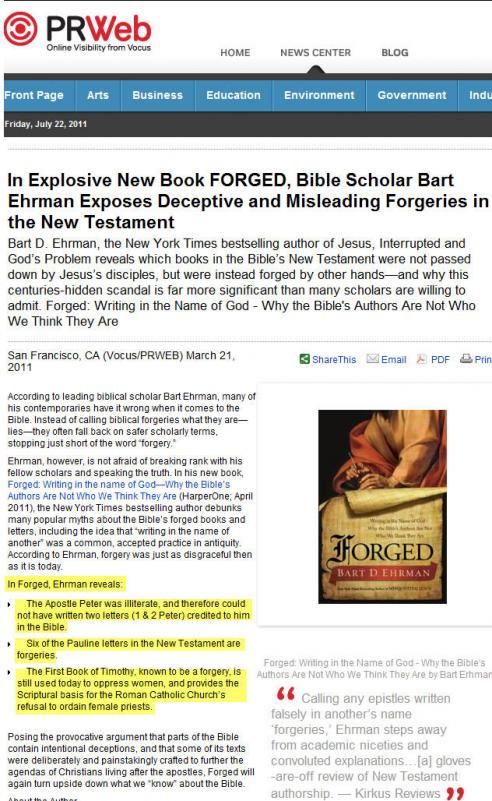 بسم الله الرحمن الرحيم http://www.prweb.com/releases/Erhman...web8219892.htm تخطى عالم الكتاب المقدس " بارت إيرمان " القواعد ... ووصف الكتاب المقدس بالمزيف والمحرف وذلك ضمن كتابه الجديد (المُزيَّف "المُحرَّف" ... الكتابة باسم الرب ... لماذا كتبة الكتاب المقدس ليسوا من نظن ! ) وقد كشف في كتابه الجديد الآتي: 1- أن الحواري (الرسول) بطرس كان أميًا لا يستطيع القراءة والكتابة .. وبالتالي لا يمكنه كتابة رسالة بطرس الاولى والثانية المنسوبتين إليه في الكتاب المقدس 2- أن 6 من رسائل باول (بولس) في العهد الجديد مزيفيين 3- أن رسالة بطرس الأولى إلى تيموثاس - المعروفة بالتزييف - لازالت تستخدم إلى اليوم لاضطهاد المرأة، والتي تمثل قاعدة النصوص الدينية التي تستخدمها الكنيسة الرومانية الكاثولكية لمنع ترسيم المرأة ككاهنة كما ذكر أن الكتاب المقدس يحتوي على مغالطات متعمدة بالإضافة للنصوص التي تم إقحامها فيه ___________________________________________ http://www.christianpost.com/news/is...-forged-49605/ وذكر في لقاء إذاعي حول كتابه الجديد أن 75% من الكتاب المقدس محرف بل ومزيف وذكر أنه بذلك يكون اول عالم بالكتاب المقدس يصف هذا الكتاب بهذا الوصف ________________ للاستماع للقاء الإذاعي لتحميل الكتاب من هنا للمزيد من مواضيعي