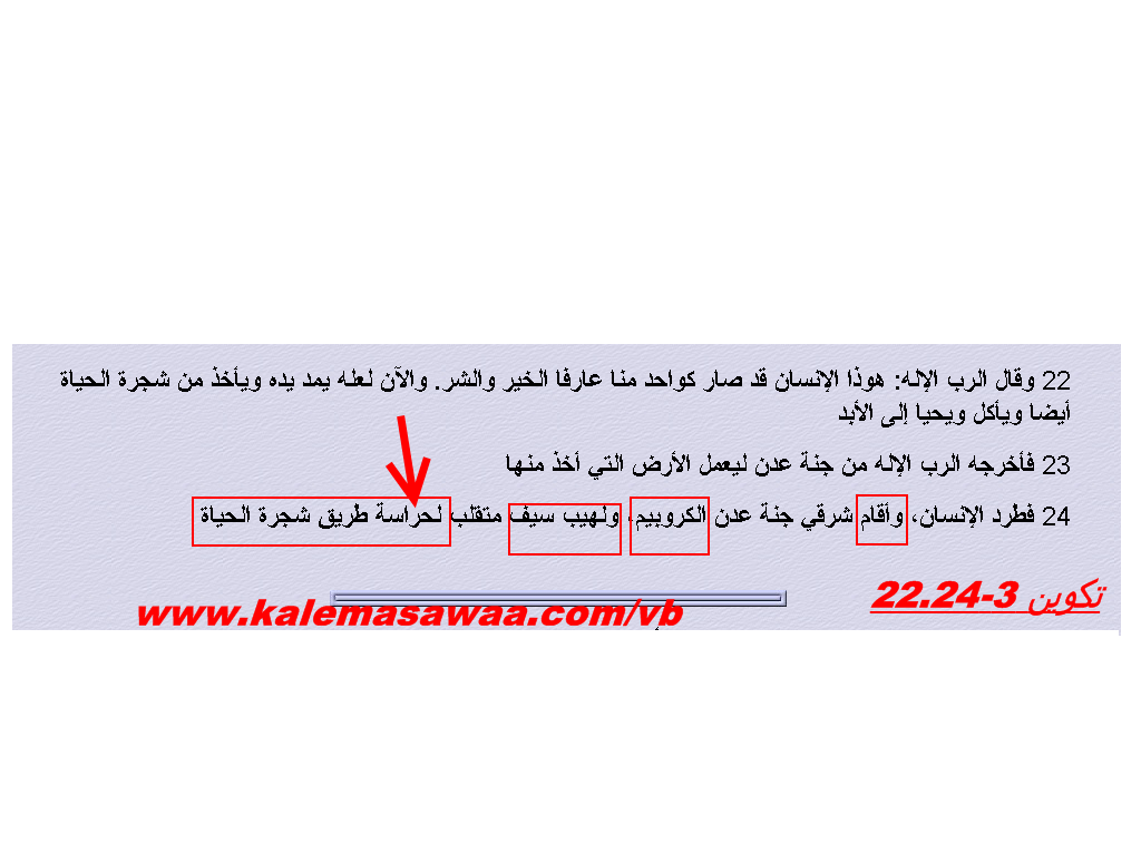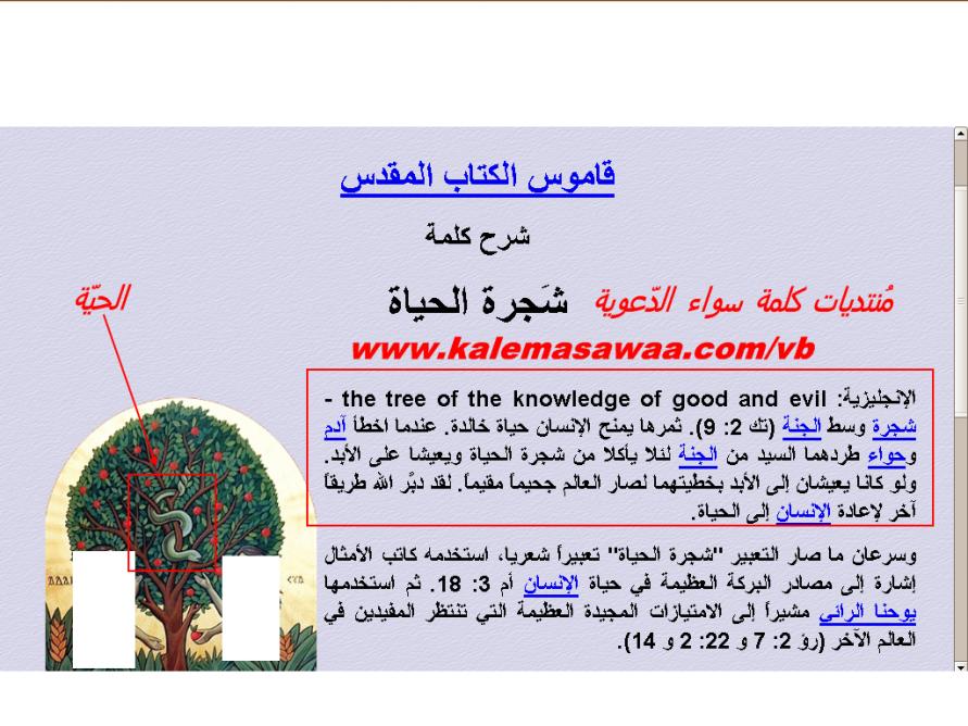السلام عليكم ورحمة الله اللهم صل على محمد وعلى آله وصحبه أجمعين تُعرف بشجرة الحياة أو "شجرة الخلود " .... مفهومها قديم قِدم الزمان ..عُرفت لدى الحضارات القديمة : اشوريين .. بابليين ..سومريين..فراعنة... هندوس...وبوذييين ...و..و..و..و..و.... تمّ حشرها حشرا- وبجميع رواسبها الوثنية - بين دفّتي الكتاب المسمى مُقدسا ... تعريفها : يُعرّفها موقع التكلا كما يلي : نجد نصا في الكتاب المشفر يتحدث عنها : وكأن الكتاب المسمى مقدسا لم تكفه الصفات المُشينة التي وُصف بها ربّه ( سكران- يصفر-قاتل- يأمر بالسرقة و الزنا و..و..و..) ليُنعَتَ من جديد بأنه يخاف من ادم ..(الربّ ) وضع حرسا ( كيروبيم ) على طريق شجرة الحياة مخافة أن يتسلل ادم الى الجنة بعد أن طُرد منها ويأكل من شجرة الخلود ؟؟؟؟ يتبع .... للمزيد من مواضيعي
