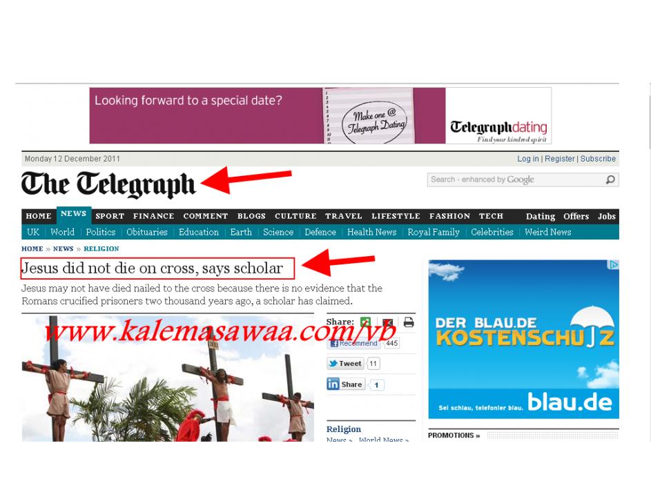 السلام عليكم ورحمة الله وبركاته اللهم صل وسلم على سيدنا محمد وعلى آله وصحبه أجمعين سلاما مزيدا مُباركا الى يوم الدين باعترافهم : يسوع لم يُصلب .. ![]() حسب صحيفة the telegraph فيسوع لم يصلب لأنه لا توجد دلائل أو قرائن تشير الى كون الرومان كانوا يصلبون مسجونيهم ![]() ![]() ![]() فضلا أنقر هُنا للمزيد من مواضيعي