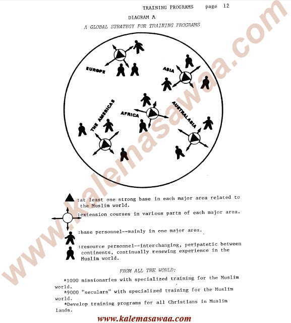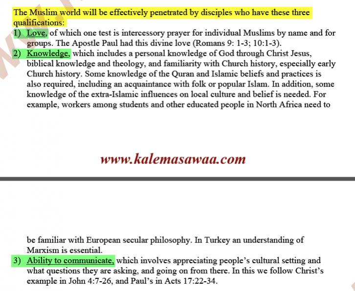 أن اختراق العالم الإسلامي يكون بالكوادر التي تملك القدرة على إظهار الحب للمسلمين ولديهم معلومات عن الكتاب المقدس والقدرة على التواصل مع المسلمين
