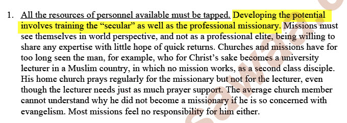 كما ورد فيها أيضًا استخدام العلمانيين في التنصير بالإضافة للمنصرين المحترفين