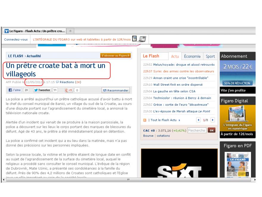 أفاد التلفزيون الكرواتي أن أحد القساوسة الكاثوليك و يبلغ من العمر 43 سنة اعتدى - بالضرب المبرح المؤدي الى الوفاة - على أحد مواطينه ، والسبب شجار نشب بين الاثنين حول توسعة مساحة احدى المقابر المحلية .