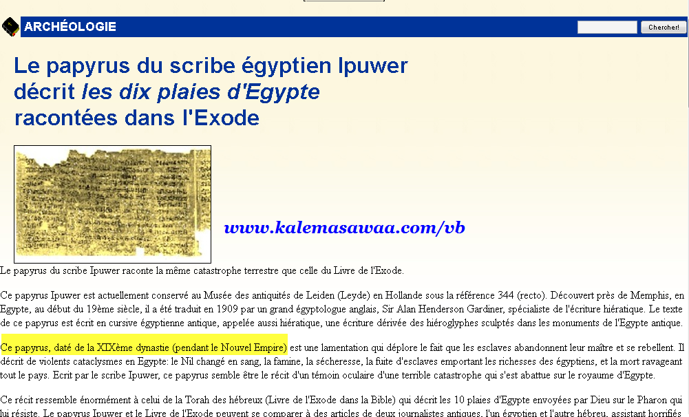 الفرعوني Ipuwer وثّق من خلال مخطوطته للكارثة : ماء النيل تحوّل لدم ، الطّاعون فتك بالبلاد ، الدّم في كلّ مكان ،، http://www.info-bible.org/histoire/a...rus-ipuwer.htm