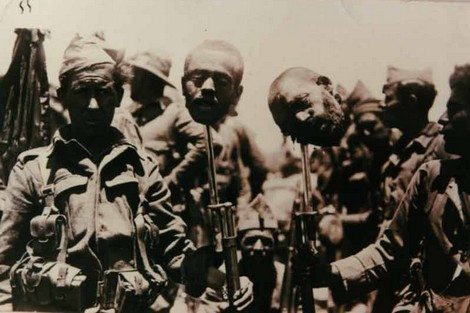 ![]() السلام عليكم ورحمة الله وبركاته اللهم صل على محمد وعلى آله وصحبه أجمعين صورة تظهر جنودا اسبان و هم يرفعون على حرابهم رؤوس مسلمين فصلت عن أجسادهم بعد أن تم قتلهم والتمثيل بجثثهم انتقاما لهزيمتهم النكراء على يد المسلمين في معركة أنوال أثناء الغزو الاسباني لشمال المغرب ، ![]() نشرت يومية El Sol في شهر أكتوبر 1921 خبراً مفاده أن نبيلة اسبانية استلمت هدية على شكل سلة من بعض الجنود الإسبان، كان بداخلها رأسان لمسلمَين مغربيين: " استلمت هذا الصباح دوقة فيكتوريا سلة من الورود، في وسط السلة كان هناك رأسان يلمعان، وهما من أجمل المئتي رأس التي تم قطفها أمس " مقتطف من كتاب : جرائم اسبانيا بالريف الباحث الإسباني : Manuel Leguineche Manuel Leguineche, Anual 1921, el desastre de España en el Rif, Madrid, Alfaguara, 1996, p.126 ------------------ ((لوقا 19 : 27 أما اعدائي اولئك الذين لم يريدوا ان املك عليهم فأتوا بهم الى هنا واذبحوهم قدامي )) للمزيد من مواضيعي