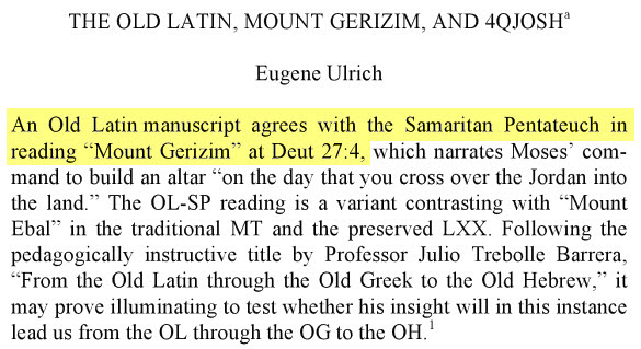 An Old Latin manuscript agrees with the Samaritan Pentateuch in reading “Mount Gerizim” at Deut 27:4, [SUP][9][/SUP]