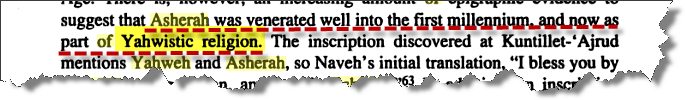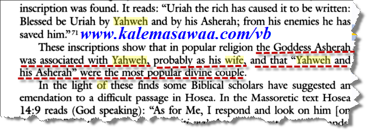 الكتابة بحروف عبرية قديمة تُشير إلى إعتقاد بعض اليهود كون معبودهم " يهوه " أتخذ زوجة له . consort = زوجة http://www.bibbiablog.com/2009/09/02...out-the-years/ ماذا يقول قاموس كتاب النصارى المقدّس بشأن " أشيرا " ؟؟؟؟ Nelsons New Illustrated Bible Dictionary: Completely Revised and Updated Edition Ronald Youngblood ![]() http://books.google.fr/books?id=r7oV...ed=0CE4Q6AEwAw ![]() كتابة أكتشفت حديثا تشير إلى كون " أشيرا " عُبدت على أنها زوجة الربّ THE LORD نفسه ..! ============== القاموس أعلاه يفيد بأنّ كلمة " أشيرا "يُقصد بها أيضا السارية أو الخشبة الموضوعة في أماكن عبادة الكنعانيين ، وقطعة الشجر هذه المنزوعة الأغصان يتم ربطها دوما بالوثن ashera ( الموجودة صورته أعلاه ) ..؟؟؟!!! ============== في كتاب : The Hebrew Goddes ( إلهة العبرانيين ) الكاتب : Raphael Patai الصفحة رقم : 53 ![]() ![]() http://books.google.fr/books?id=VfAX...YAHWEH&f=false ![]() الكتابة ( كشف صحراء سيناء الأثري ) يفيد بأن " أشيرا " تمّ ربطها ( لها صلة ) ب " يهوه " ، "يهوه " و "أشيرا " أعتبرا كأشهر زوجين من الألهة ...! ![]() ![]() يُتبع بإذنه تعالى .... للمزيد من مواضيعي