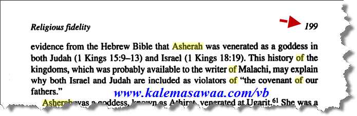 عُدنا ولله الحمدُ ، و سنواصل بإذنه تعالى قصف شبهة المُنصّر ،، نقرأ في كتاب : Zechariah 9-14 and Malachi: A Commentary تفسير زكرياء 9 - 14 و ملاخي ، ![]() الكاتب : David L. Petersen الصفحة رقم : 199 الرابط : http://books.google.it/books?id=2Kvk...yahweh&f=false ![]() الدليل من التوراة على أنّ أشيرا عُبدت كإلهة في كل من يهوذا و إسرائيل ، قصة هذه الممالك التي كانت - من المحتمل - متاحة لكاتب ملاخي تفسر لمَ تمّ إدراج يهوذا و إسرائيل على حدّ سواء كمخالفين لعهد الآباء . !!!!!!!!!!!!!!!!!!!!!!!!! ملوك 1 -15: 9- 13 وَفِي السَّنَةِ الْعِشْرِينَ لِيَرُبْعَامَ مَلِكِ إِسْرَائِيلَ، مَلَكَ آسَا عَلَى يَهُوذَا. مَلَكَ إِحْدَى وَأَرْبَعِينَ سَنَةً فِي أُورُشَلِيمَ، وَاسْمُ أُمِّهِ مَعْكَةُ ابْنَةُ أَبْشَالُومَ ، وَعَمِلَ آسَا مَا هُوَ مُسْتَقِيمٌ فِي عَيْنَيِ الرَّبِّ كَدَاوُدَ أَبِيهِ، وَأَزَالَ الْمَأْبُونِينَ مِنَ الأَرْضِ، وَنَزَعَ جَمِيعَ الأَصْنَامِ الَّتِي عَمِلَهَا آبَاؤُهُ، حَتَّى إِنَّ مَعْكَةَ أُمَّهُ خَلَعَهَا مِنْ أَنْ تَكُونَ مَلِكَةً، لأَنَّهَا عَمِلَتْ تِمْثَالاً لِسَارِيَةٍ، وَقَطَعَ آسَا تِمْثَالَهَا وَأَحْرَقَهُ فِي وَادِي قَدْرُونَ. ملحوظة : السارية هي أشيرا التي أشرنا إليها سابقا . ملوك 1 - 18 : 19 فَالآنَ أَرْسِلْ وَاجْمَعْ إِلَيَّ كُلَّ إِسْرَائِيلَ إِلَى جَبَلِ الْكَرْمَلِ، وَأَنْبِيَاءَ الْبَعْلِ أَرْبَعَ الْمِئَةِ وَالْخَمْسِينَ، وَأَنْبِيَاءَ السَّوَارِي أَرْبَعَ الْمِئَةِ الَّذِينَ يَأْكُلُونَ عَلَى مَائِدَةِ إِيزَابَلَ». ملحوظة : بعل BAAL ( و معناها السيد ) هو معبود الكنعانيين ، عبده العبرانيون فيما بعد على أنه هو نفسه يهوه / EL ![]() أشيرا كانت إلهة ، عُرفت بإسم أثيرا ، عُبدت بمنطقة أوغاريت ( بدولة سورية الحالية ) ، أعتبرت بمثابة الزوجة للربّ EL ، هي ( أشيرا ) أمّ السبعين إبنا ، أشيرا عُبدت كإلهة خلال الألفية الأولى و هي الآن تشكل جزءا من ديانة يهوه ، يُتبع بإذنه تعالى ....