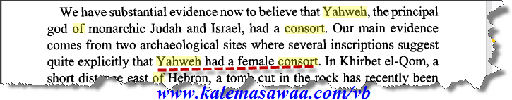 عُدنا ولله الحمدُ ، كتاب : The Misconception Trilogy: Book 1: The Genesis of Misconception ( ثلاثية الفهم الخاطئ ) الكاتب : Paul John الصفحة رقم : 48 ![]() ![]() http://books.google.fr/books?id=lcUt...yahweh&f=false هل الربّ أو " يهوه " كانت له زوجة ؟؟؟ أشيرا كانت زوجة EL أو يهوه أو الإثنين معا حسب إختلاف العصور ، في كنعان و منطقة شمال فلسطين كانت أشيرا زوجة EL ، بعد سنوات تحولت أشيرا إلى زوجة ل يهوه خاصة في منطقة يهودا و المناطق الجنوبية ، الكتبة جعلوا من EL هو نفسه يهوه ، و هكذا تركوا العوام يعتقدون الشيء ذاته ،، يُتبع بإذن الله ..... المزيد من مواضيعي