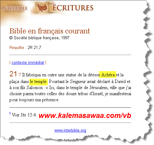 الإلهة أشيرا كانت تُعبد في بيت الربّ بأورشليم( القدس) سفر الملوك الثاني 7:21 ترجمة فرنسية