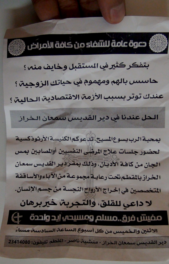 ![]() قامت الكنيسة الأرثوذكسية المصرية ، بإطلاق حملتها المكثفة لدعوة الأقباط والمسلمين إلى زيارة دير «سمعان الخراز» بالمقطم، للعلاج من وهم الإصابة بالجن أو التوتر النفسي الناتج عن الظروف الاقتصادية الحالية -كما كتبت في الإعلان الذي يوزع حاليًا بشكل كثيف-. وقامت الكنيسة بتوزيع منشورات دعائية في بعض الأماكن وخصوصًا القرى والنجوع، كتبت فيها عبارات تشجيعية على الذهاب إلى الدير للشفاء من كافة الأمراض التي يعاني منها أي شخص سواء كان مسلم أو نصراني. ونشرت الكنيسة عبر وسائل الإعلام المختلفة للمرة الأولى مشاهد وصور لفتيات محجبات يلبسن الخمار وهن في انتظار دورهن للعرض على الكاهن أو القس المتخصص بهذا الشأن. كما تتعمد جميع وسائل الإعلام نشر الروايات الشائعة حول ما يحدث في الكنيسة وبعض القنوات بالبث المباشر كقناة "أون تي في والنهار والقناة الرسمية للكنيسة وسي بي سي"، والتى تضفى هالة من المصداقية والقداسة على المكان ورهبانه ، وكيف يعالجون أصعب الأمراض بصرف النظر عن كونها عضوية أو نفسية ، وكأننا ما زلنا فى العصور الوسطى. وتعد هذه الواقعة الثانية من نوعها والتي تتعمد فيها الكنيسة نشر دعاية إعلانية عبر الصحف والمواقع، حيث قامت منذ سنوات بتصوير فيديو لقس يدعى «مكاري يونان» وهو يقوم ببعض الطقوس على رؤوس بعض الفتيات المسلمات في تحدٍ صارخ للمسلمين وبالمخالفة لتعاليم الإسلام الذي يعد الدين الرسمي للدولة. تعتبر تلك الممارسات طريقة جديدة تبتكرها الكنيسة المصرية لتنصير المسلمين عبر السحر والأعمال الشيطانية التي يجيدها قساوسة الكنيسة الأرثوذكسية. بتصرف من شبكة المخلص للمزيد من مواضيعي