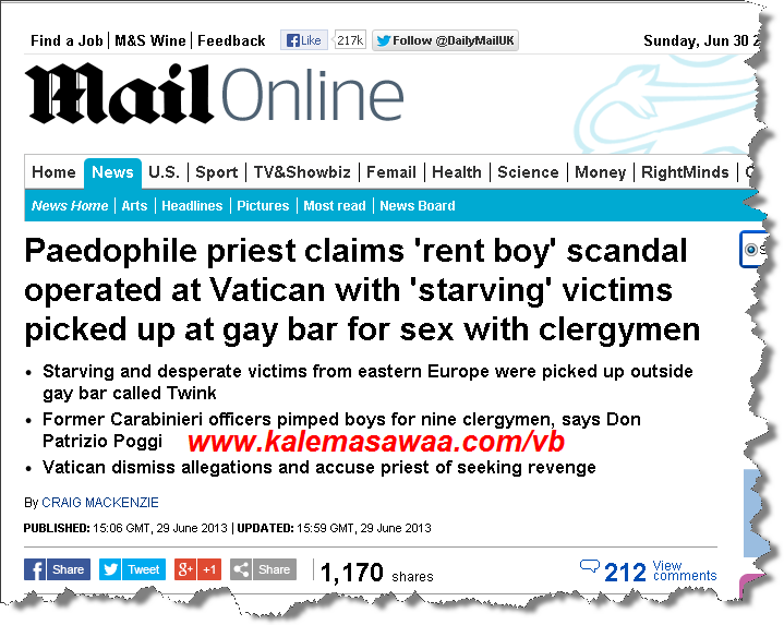 ![]() اللهم صل على محمد وعلى آله وصحبه أجمعين ، ![]() نقلت الصحيفة البريطانية مزاعم قس متهم بالتحرش بالأطفال بوجود حلقة "قوادة" تعمل داخل الفاتيكان لاستغلال المحتاجين من المراهقين ممارسة الجنس مع رجال دين في فضيحة أطلق عليها "صبي الإيجار." وطبقاً لـ"ديلي ميل"" قدم دون باتريزيو بوغي، 46 عاما، الذي قضّى عقوبة بالسجن لمدة خمسة أعوام لتحرشه جنسياً بأطفال داخل دير خارج روما، لائحة تضم أسماء تسعة من القساوسة كانوا يستعينون بحلقة يديرها رجال دين داخل الفاتيكان، لتوفير فتية، كان يجري التقاطهم خارج بار لمثليي الجنس، لممارسة الجنس معهم، وأضاف بوغي أن الفتية، وغالبيتهم من أوروبا الشرقية، جرى استغلالهم لحاجتهم، زاعماً أن تصريحاته هدفها "حماية الكنيسة والمجتمع المسيحي"، وبدوره نفى الفاتيكان تلك المزاعم قائلاً إنها ليست سوى "انتقام" بعد رفض إعادته للكنيسة. المصدر : cnn عربي ![]() ![]() ![]() للمزيد من مواضيعي