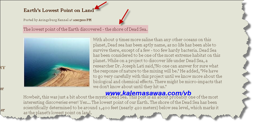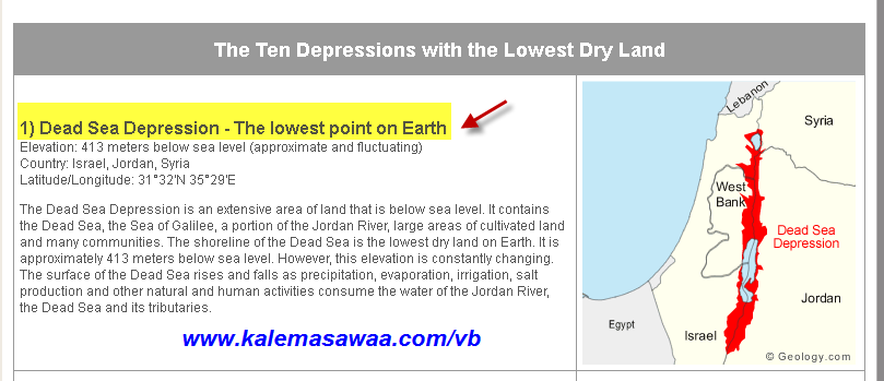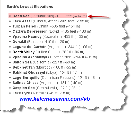 الكلام أعلاه هو مقتبس من موقع يهودي http://www.goisrael.com/Tourism_Eng/...al%20Info.aspx http://www.g-kexoticfarms.com/earth_facts.htm المقياس أعلاه بالقدم : 1302FT = 396,24 m http://www.convertworld.com/fr/ ![]() http://discoverytimes.blogspot.com/2011/03/earths-lowest-point-on-land.html