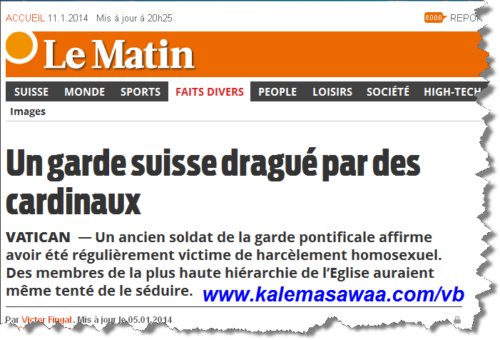 ![]() اللهم صل على محمد وعلى آله وصحبه أجمعين،، أحد أفراد الحرس السويسري يتعرّض لتحرش جنسي ...و أين ؟؟؟ في قلب الفاتيكان . ![]() موقع 20 دقيقة السويسري نقل الواقعة مبينا أنّ الضحية قد تعرض لأكثرمن 20 محاولة كان أبطالها قساوسة و كرادلة . الحارس لم يتردّد في رفع شكاية بالأمر لقادته ، لكنه للأسف الشديد لم يجد من يُنصفه . الخبر كما نقلته صحيفة الصباح السويسرية : ![]() الفضيحة ذاتها على صحيفة أخبار السويسري : ![]() للمزيد من مواضيعي